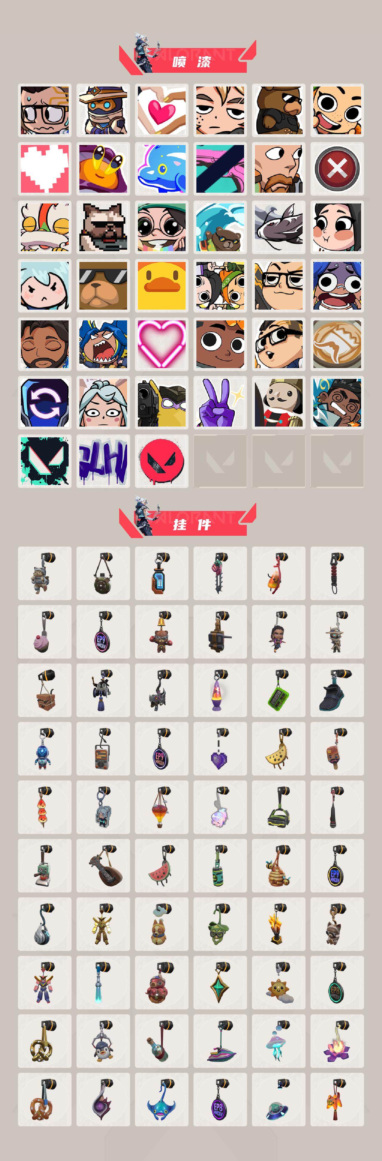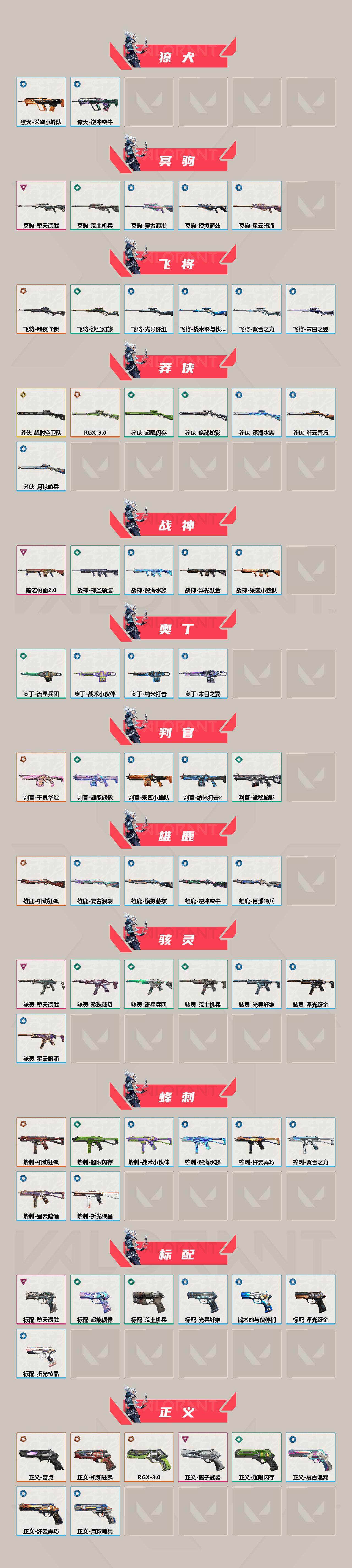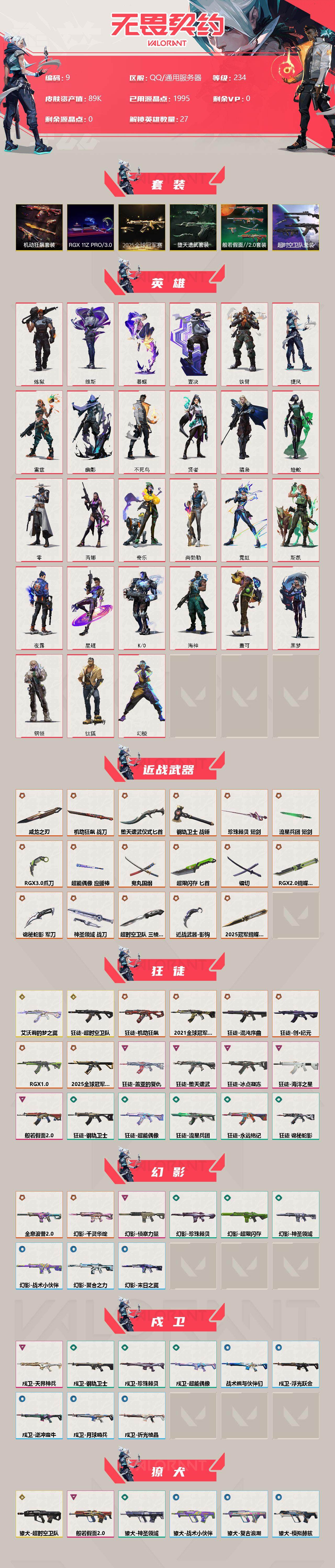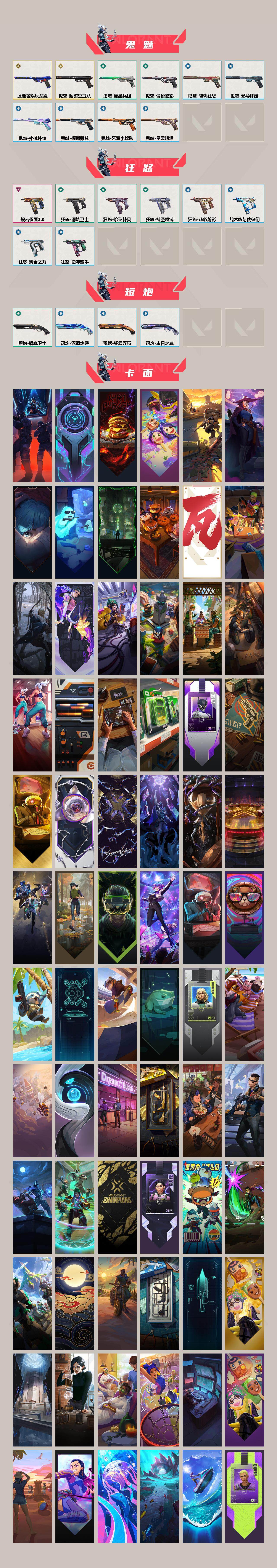 - [12959850]【英雄】:炼狱,维斯,捷风,雷兹,不死鸟,贤者,猎枭,星礈 【幻影】:幻影-侦察力量 【卡面】:代号红色 卡面,新兵报到 卡面,V契约 卡面,无畏契约 卡面 【喷漆】:胜利属于无畏契约 喷漆,GLHF 喷漆,无畏契约 喷漆 【挂饰】:无畏契约 纪念币 挂饰