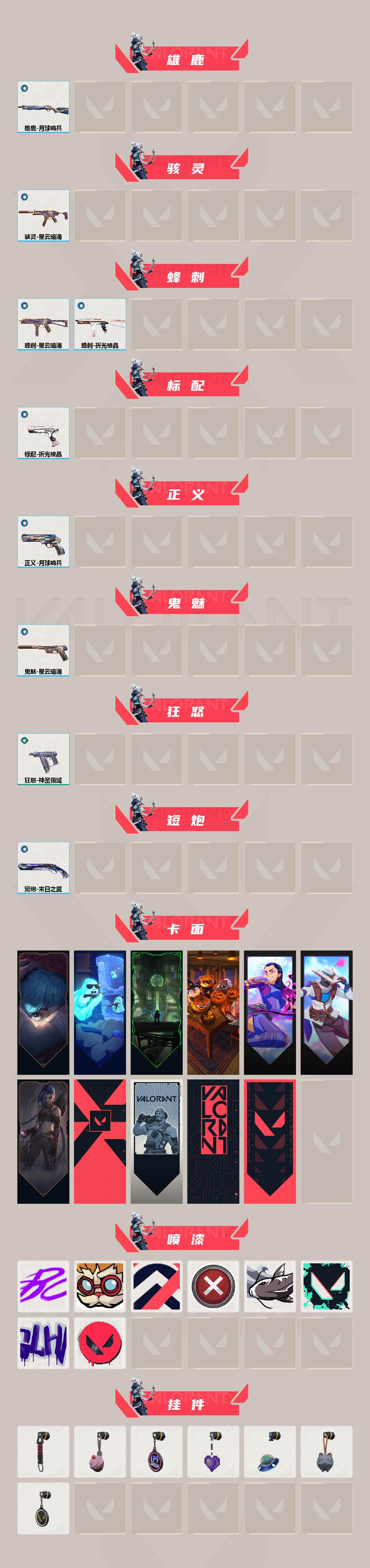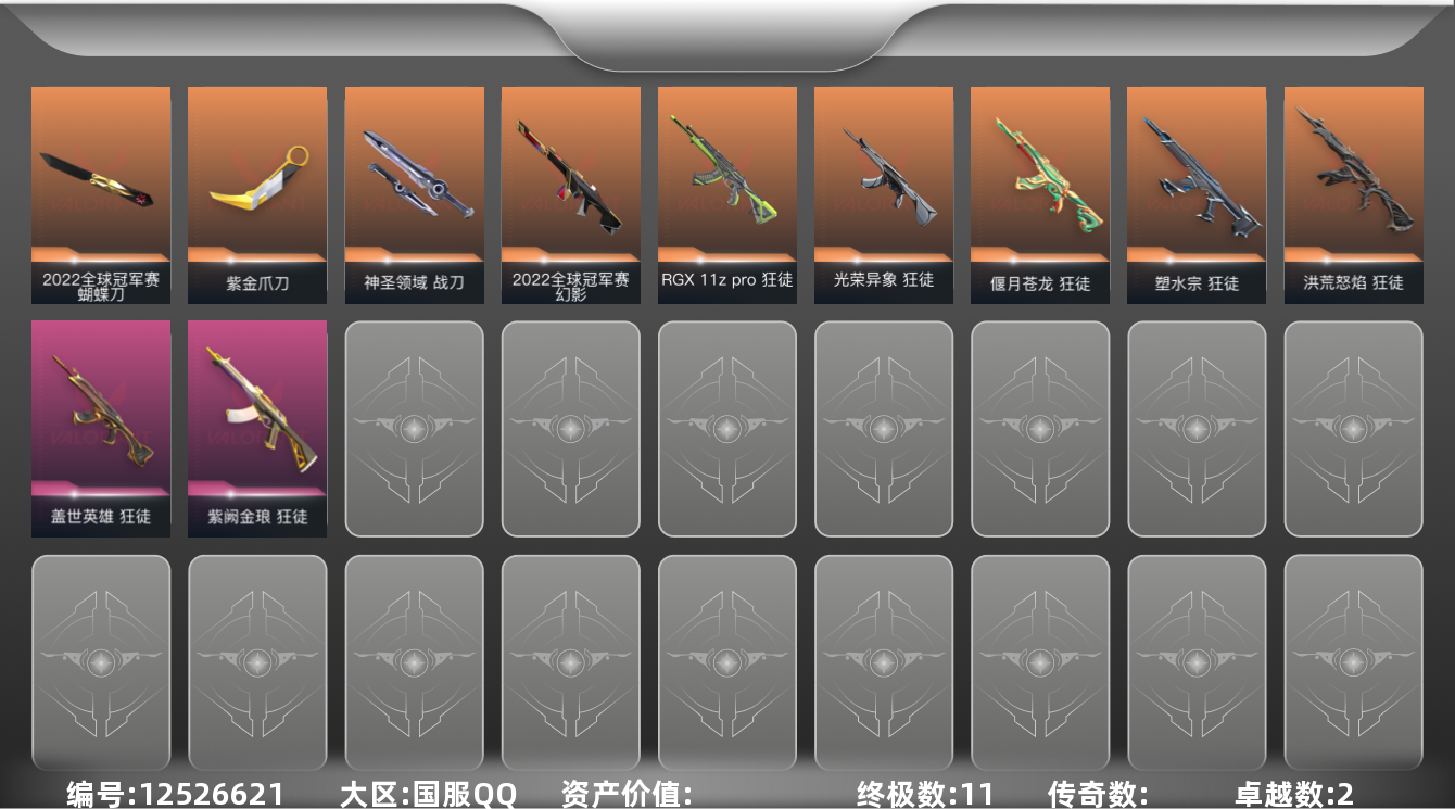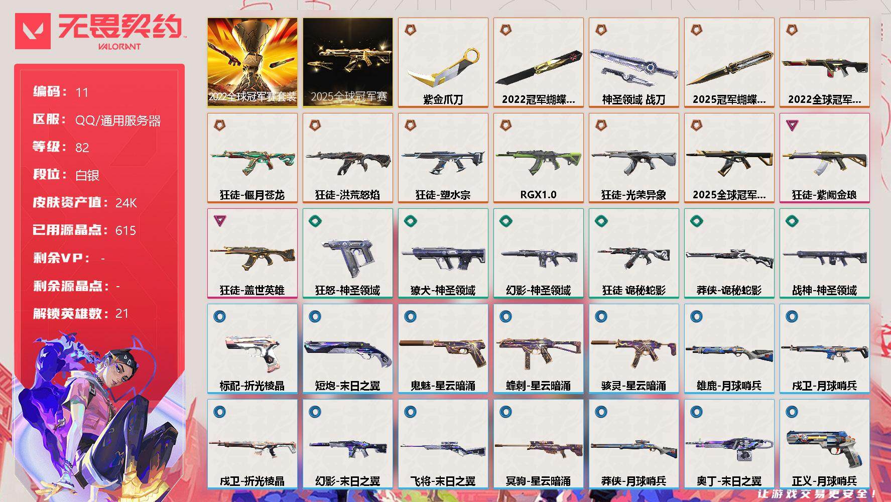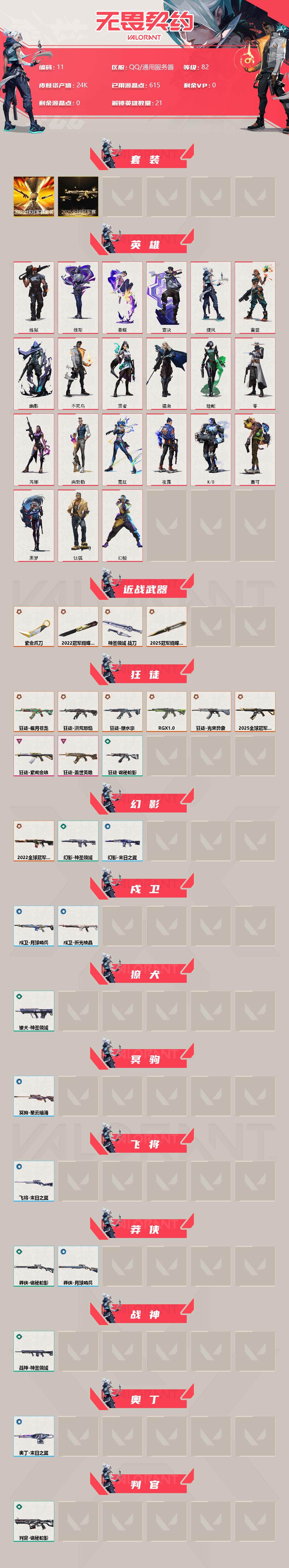 [12526621]【套装】:2025全球冠军赛套装,2022全球冠军赛套装 【英雄】:幻棱,炼狱,维斯,暮蝶,钛狐,壹决,捷风,雷兹,幽影,不死鸟,贤者,猎枭,蝰蛇,零,芮娜,尚勃勒,霓虹,夜露,K/O,盖可,黑梦 【近战 武器】:近战武器-2025全球冠军赛 蝴蝶刀,近战武器-2022全球冠军赛 蝴蝶刀,近战武器-紫金爪刀,近战武器-神圣领域 战刀 【狂徒】:狂徒-2025全球冠军赛,狂徒-洪荒怒焰,狂徒-塑水宗,狂徒-偃月苍龙,狂徒-RGX 11z Pro,狂徒-光荣异象,狂徒-盖世英雄,狂徒-紫阙金琅,狂徒-诡秘蛇影 【幻影】:幻影-2022全球冠军赛,幻影-神圣领域,幻影-末日之翼 【戍卫】:戍卫-月球哨兵,戍卫-折光棱晶 【獠犬】:獠犬-神圣领域 【冥驹】:冥驹-星云暗涌 【飞将】:飞将-末日之翼 【莽侠】:莽侠-诡秘蛇影,莽侠-月球哨兵 【战神】:战神-神圣领域 【奥丁】:奥丁-末日之翼 【判官】:判官-诡秘蛇影 【雄鹿】:雄鹿-月球哨兵 【骇灵】:骇灵-星云暗涌 【蜂刺】:蜂刺-星云暗涌,蜂刺-折光棱晶 【标配】:标配-折光棱晶 【正义】:正义-月球哨兵 【鬼魅】:鬼魅-星云暗涌 【狂怒】:狂怒-神圣领域 【短炮】:短炮-末日之翼 【卡面】:《双城之战》拥抱 卡面,精灵大战 卡面,欢迎来到底城 卡面,南瓜盛典 卡面,无畏契约GO!第一卷:芮娜 卡面,无畏契约GO!第一卷:零 卡面,《双城之战》金克丝 卡面,代号红色 卡面,新兵报到 卡面,V契约 卡面,无畏契约 卡面 【喷漆】:嘭! 喷漆,都算到了 喷漆,控场勿近 喷漆,买装还是存钱 喷漆,松叶 喷漆,胜利属于无畏契约 喷漆,GLHF 喷漆,无畏契约 喷漆 【挂饰】:伞绳 挂饰,《双城之战》小蛋糕 挂饰,第九季//第三幕 纪念币 挂饰,薰衣草之心 挂饰,天外飞客 挂饰,《双城之战》魄罗 挂饰,无畏契约 纪念币 挂饰