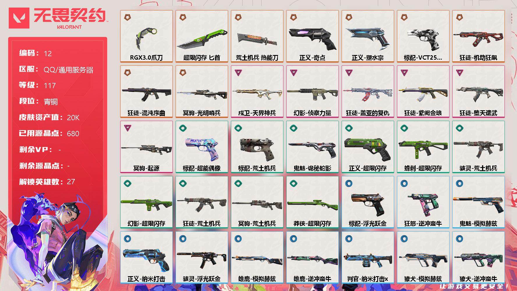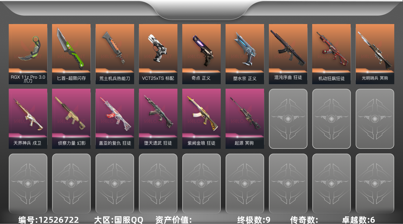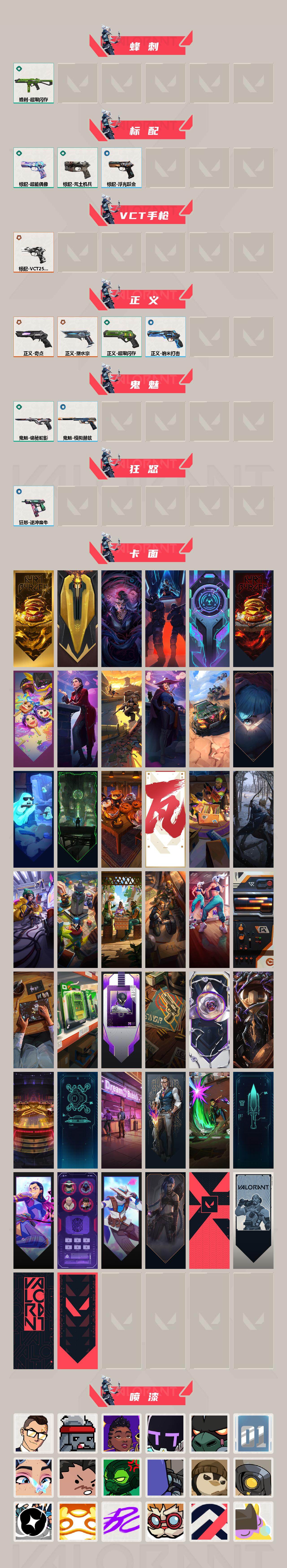 [12526722]【英雄】:幻棱,炼狱,维斯,暮蝶,钛狐,壹决,铁臂,捷风,雷兹,幽影,不死鸟,贤者,猎枭,蝰蛇,零,芮娜,奇乐,尚勃勒,霓虹,斯凯,夜露,星礈,K/O,海神,盖可,黑梦,钢锁 【近战 武器】:近战武器-RGX 11z Pro//3.0 爪刀,近战武器-超限闪存 匕首,近战武器-荒土机兵 热能刀 【狂徒】:狂徒-混沌序曲,狂徒-机动狂飙,狂徒-堕天遗武,狂徒-盖亚的复仇,狂徒-紫阙金琅,狂徒-荒土机兵 【幻影】:幻影-侦察力量,幻影-超限闪存,幻影-纳米打击 【戍卫】:戍卫-天界神兵,戍卫-浮光跃金,戍卫-逆冲蛮牛 【獠犬】:獠犬-模拟赫兹,獠犬-逆冲蛮牛 【冥驹】:冥驹-光明哨兵,冥驹-起源,冥驹-荒土机兵,冥驹-模拟赫兹 【莽侠】:莽侠-超限闪存 【战神】:战神-浮光跃金 【奥丁】:奥丁-纳米打击 【判官】:判官-纳米打击x 【雄鹿】:雄鹿-模拟赫兹,雄鹿-逆冲蛮牛 【骇灵】:骇灵-荒土机兵,骇灵-浮光跃金 【蜂刺】:蜂刺-超限闪存 【标配】:标配-超能偶像,标配-荒土机兵,标配-浮光跃金 【VCT手枪】:标配-VCT25 x TS 【正义】:正义-奇点,正义-塑水宗,正义-超限闪存,正义-纳米打击 【鬼魅】:鬼魅-诡秘蛇影,鬼魅-模拟赫兹 【狂怒】:狂怒-逆冲蛮牛 【卡面】:终章:激斗汉堡 卡面,进入射程 卡面,分崩离析 卡面,纳米打击 卡面,抑制技术 卡面,激斗汉堡 卡面,瓦娃脸雪糕 P2 卡面,从黄昏到黎明 卡面,荒土机兵 卡面,银弹猎手 卡面,逆冲蛮牛 卡面,《双城之战》拥抱 卡面,精灵大战 卡面,欢迎来到底城 卡面,南瓜盛典 卡面,VCT CN首冠 卡面,唱片的故事 卡面,钢弓与箭弦 卡面,排除故障 卡面,战术桌游 卡面,悠享食光 卡面,修车达人 卡面,热舞环节 卡面,模拟赫兹 卡面,浮光跃金 卡面,超限闪存 卡面,维斯工牌 卡面,正义的化身 卡面,铁之华 卡面,时间到 卡面,最高舞台 卡面,声感陷阱设计图 卡面,梦幻奶茶 卡面,无畏契约:尚勃勒 卡面,源能反应 卡面,零点嗅探设计图 卡面,无畏契约GO!第一卷:芮娜 卡面,清除名单 卡面,无畏契约GO!第一卷:零 卡面,《双城之战》金克丝 卡面,代号红色 卡面,新兵报到 卡面,V契约 卡面,无畏契约 卡面 【喷漆】:小小心意 喷漆,战“素”兔 喷漆,宇宙的指引 喷漆,请求重启 喷漆,逆冲蛮牛 喷漆,纳