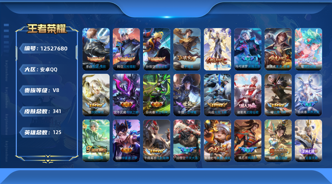 [12527680]【商品标题】:安卓Q-V8-永恒钻石I段位-125英雄-341皮肤-3典藏-0珍品无双-0无双-0珍品传说-28传说-108史诗