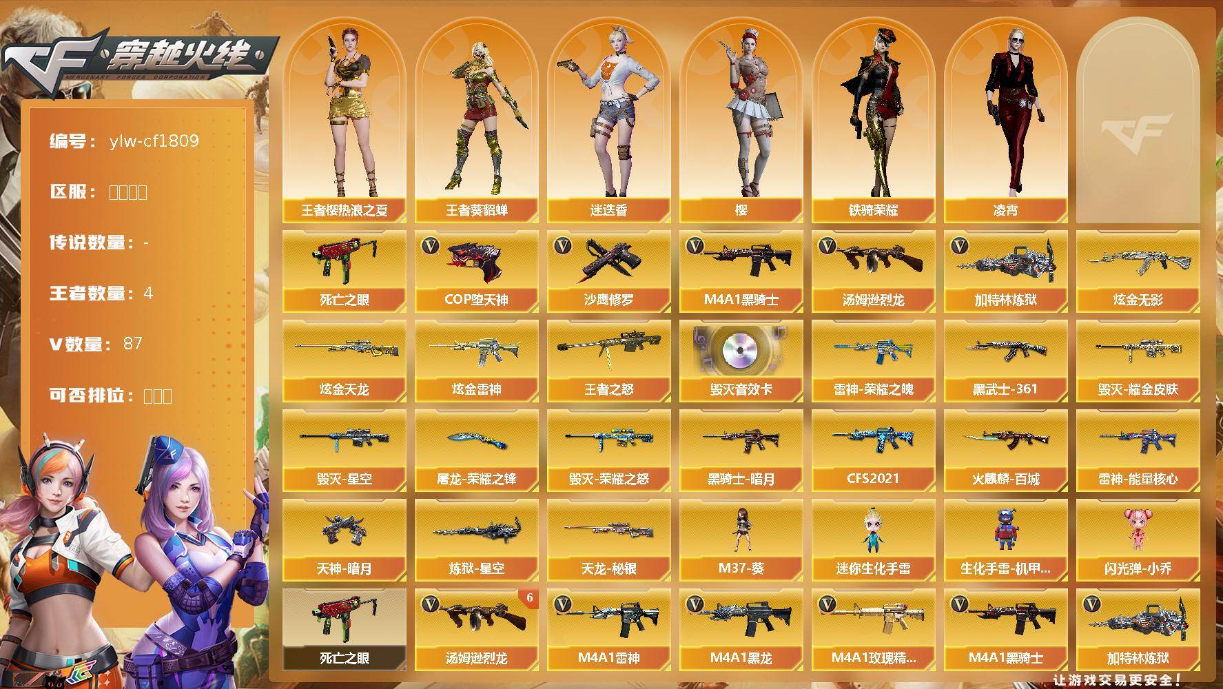 [12528045]【商品标题】:黑龙江区-87V-4王者-5炫金 【热门武器】:死亡之眼,M4A1-黑骑士,汤姆逊-烈龙*7,加特林-炼狱,COP-堕天神,沙鹰-修罗*3 【王者炫金武器】:炫金无影,炫金天龙*3,炫金雷神,王者之怒 【音效卡】:Barrett-毁灭音效卡 【稀有皮肤】:雷神-能量核心*2,雷神-荣耀之魄,火麒麟-百城,黑骑士-暗月,黑骑士-CFS2021,炼狱-星空,毁灭-荣耀之怒,毁灭耀金皮肤,毁灭-星空,天龙-秘银,AK47-黑武士-361,天神-暗月,屠龙-荣耀之锋 【角色】:王者樱-热浪之夏,王者-葵-貂蝉,樱,凌霄,迷迭香,铁骑荣耀 【人偶武器】:M37-葵,迷你生化手雷,生化手雷-机甲核心,闪光弹-小乔 【暴走生化】:死亡之眼 【英雄级武器】:闪光弹-竞技荣光,M4A1-夜魔*2,破空枪刃-夜魔*2,马来剑-夜魔,COP-堕天神,麒麟刺-堕天神,无影-神兵利器,M4A1-雷神*3,M4A1-黑龙,M4A1-玫瑰精灵,M4A1-黑骑士,加特林-炼狱,汤姆逊-烈龙*7,AK47-无影,AK47-火麒麟*4,AK47-黑武士,AK12-天启,AWM-天龙,Barrett-毁灭*2,AWM-裁决,M4A1-龙血*4,AK47-黑鲨*2,M4A1-千变,AK-47-猩红传说*6,AK47-B-战神,沙鹰-天神,沙鹰-修罗*3,龙啸,屠龙 【特殊枪械】:,1黑骑士,6烈龙,,1炼狱,