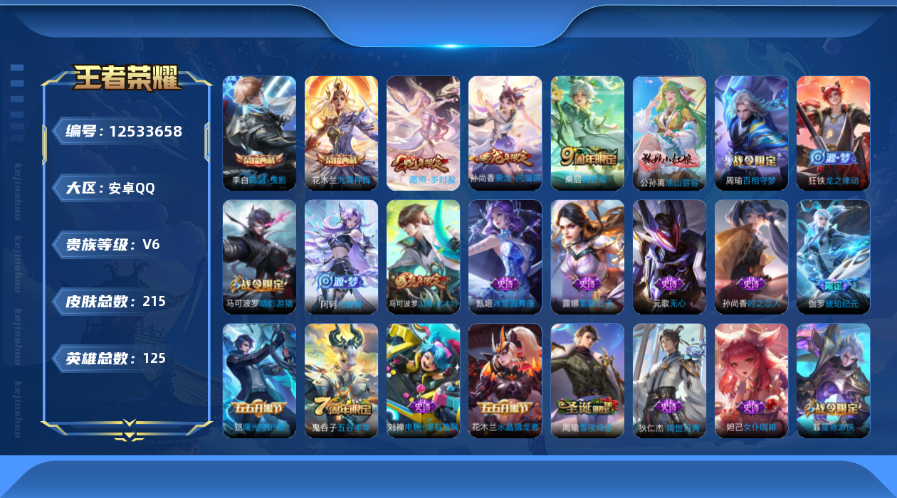 - [12727997]安卓Q-V8-最强王者段位-126英雄-263皮肤-1典藏-0珍品无双-0无双-0珍品传说-13传说-80史诗 【英雄全皮】:鬼谷子全皮,李信全皮,蒙恬全皮,戈娅全皮 【荣耀典藏】:诸葛亮星域神启 【传说皮肤】:桑启鸣野蒿,李信山海炽霜斩,吕布怒海麟威,孙尚香异界灵契,赵云淬星耀世,铠绛天战甲,虞姬启明星使,曜云鹰飞将,李信一念神魔,貂蝉猫影幻舞,干将莫邪久胜战神,诸葛亮武陵仙君,孙悟空地狱火 【限定皮肤】:蒙犽顽岩魄,姜子牙天穹之誓,狄仁杰阴阳师,赵云皇家上将,墨子神迹守卫,嬴政优雅恋人,孙尚香异界灵契,鲁班七号乒乒小将,钟无艳超时空战士,扁鹊奇幻香踪,芈月幻夜卜梦,元歌无心,甄姬落雪兰心,马可波罗暗影游猎,马可波罗山海玄木吟,狄仁杰魔术师,狄仁杰万华元夜,达摩沙漠行僧,项羽海滩派对,老夫子醍醐杖,老夫子航海奇遇记,兰陵王金庭之子,花木兰青春决赛季,孙悟空至尊宝,孙悟空孙行者,后羿圣弓游侠,刘备百相守梦,李元芳云中旅人,虞姬启明星使,钟馗驱傩正仪,杨戬潮玩骑兵,干将莫邪真爱魔法,鬼谷子原初探秘者,鬼谷子五谷丰年,诸葛亮武陵仙君,黄忠火炮绅士,苏烈千军破阵,百里玄策原初追逐者,沈梦溪大漠名商,裴擒虎李小龙,裴擒虎擒涛扼浪,云中君纤云弄巧,李信山海炽霜斩,猪八戒西部大镖客,上官婉儿梁祝,嫦娥拒霜思,嫦娥暖冬兔眠,西施玲珑珍味,鲁班大师探海日志,桑启海盐诗旅,暃星界游侠,戈娅驭风魔法,艾琳女武神,艾琳流音漫舞,司空震地狱燃心,阿古朵江河有灵,张良古海寻踪,蒙恬荣光圣徽,鬼谷子天穹祈灯,沈梦溪龙舞盛年,刘邦剑破天穹,周瑜熔金海岸 【年限皮肤】:马超神威,马可波罗山海玄木吟,李信山海炽霜斩 【赛季限定】:狄仁杰万华元夜,达摩沙漠行僧,老夫子醍醐杖,兰陵王金庭之子,张良古海寻踪,李元芳云中旅人,钟馗驱傩正仪,鬼谷子原初探秘者,苏烈千军破阵,百里玄策原初追逐者,沈梦溪大漠名商,裴擒虎擒涛扼浪,鲁班大师探海日志,桑启海盐诗旅,鬼谷子天穹祈灯,蒙恬荣光圣徽,刘邦剑破天穹,姜子牙天穹之誓 【战令限定】:墨子神迹守卫,钟无艳超时空战士,扁鹊奇幻香踪,芈月幻夜卜梦,甄姬落雪兰心,马可波罗暗影游猎,老夫子航海奇遇记,艾琳流音漫舞,后羿圣弓游侠,杨戬潮玩骑兵,干将莫邪真爱魔法,黄忠火炮绅士,猪八戒西部大镖客,嫦娥暖冬兔眠,西施玲珑珍味,司空震地狱燃心,暃星界游侠,戈娅驭风魔法 【史诗皮肤】