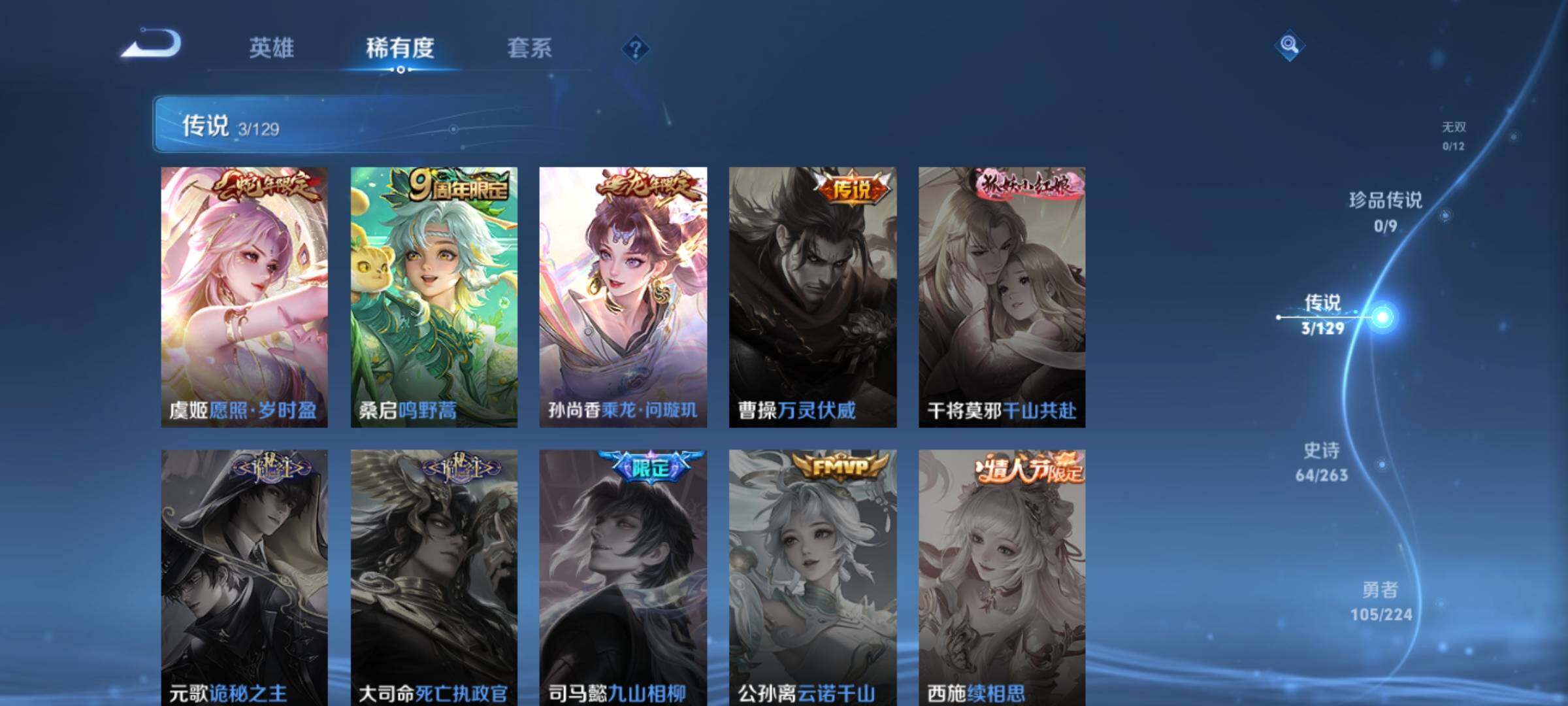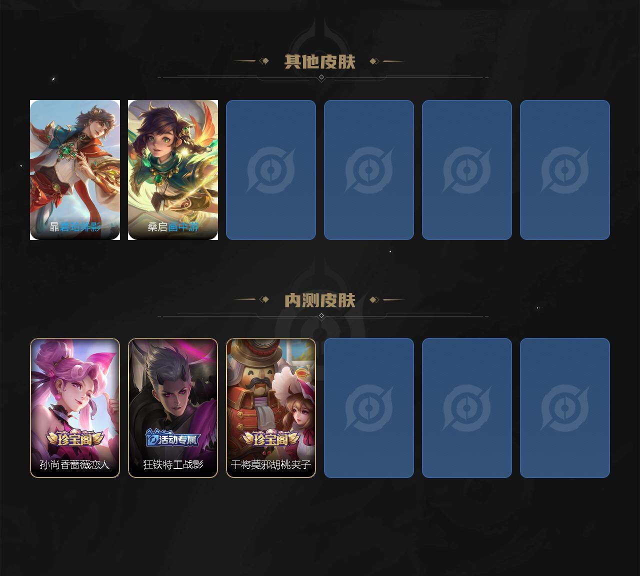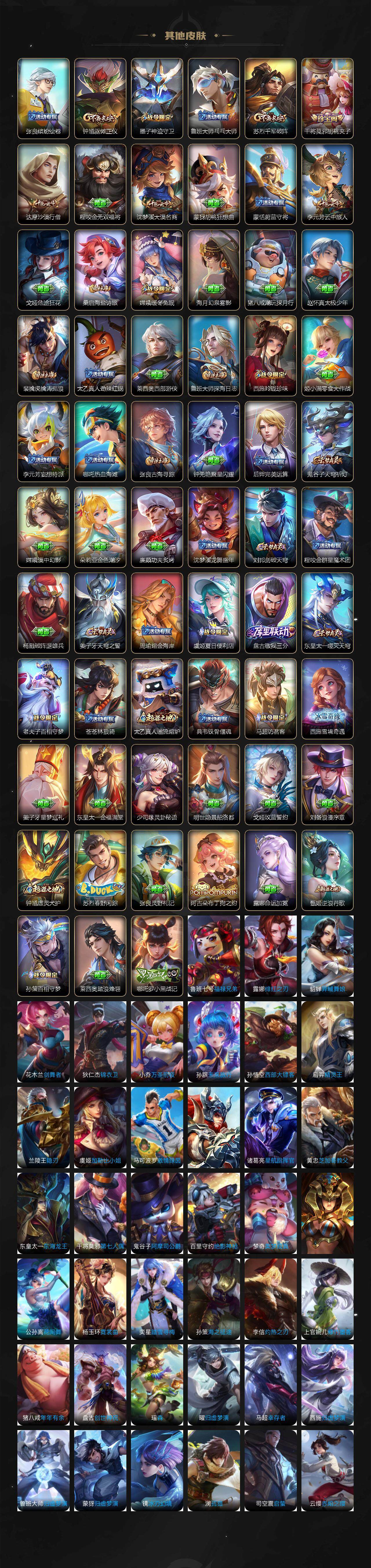 【限定皮肤】:蒙犽顽岩魄,蔡文姬夏日便利店,虞姬夏日便利店,姜子牙天穹之誓,杨戬破阵退雄兵,狄仁杰阴阳师,赵云皇家上将,墨子神迹守卫,孙尚香蔷薇恋人,庄周高山流水,高渐离死亡摇滚,元歌无心,马可波罗暗影游猎,马可波罗山海玄木吟,狄仁杰魔术师,狄仁杰万华元夜,达摩沙漠行僧,项羽海滩派对,老夫子航海奇遇记,程咬金演武夺筹,李元芳云中旅人,钟馗驱傩正仪,杨玉环遇见飞天,干将莫邪胡桃夹子,雅典娜黎明之约,鬼谷子五谷丰年,苏烈千军破阵,百里玄策原初追逐者,梦奇顽趣,沈梦溪大漠名商,裴擒虎擒涛扼浪,嫦娥暖冬兔眠,西施玲珑珍味,鲁班大师探海日志,桑启海盐诗旅,暃星界游侠,戈娅驭风魔法,阿古朵江河有灵,张良古海寻踪,蒙犽百解令,蒙恬荣光圣徽,鬼谷子天穹祈灯,伽罗琥珀纪元,孙尚香乘龙问璇玑,沈梦溪龙舞盛年,刘邦剑破天穹,程咬金群星魔术团,周瑜熔金海岸