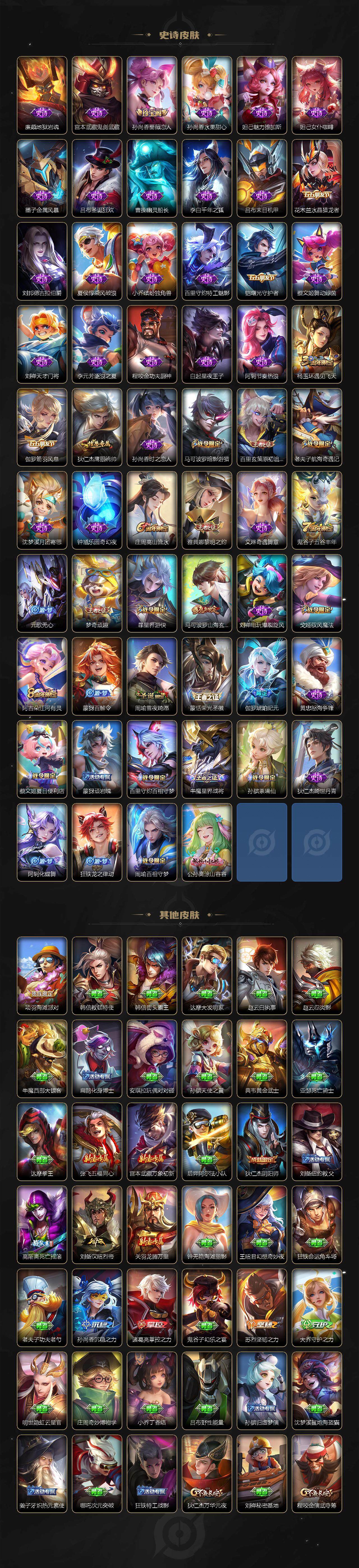 【史诗皮肤】:露娜紫霞仙子,赵云皇家上将,貂蝉圣诞恋歌,甄姬冰雪圆舞曲,王昭君偶像歌手,狄仁杰魔术师,廉颇地狱岩魂,宫本武藏鬼剑武藏,孙尚香蔷薇恋人,孙尚香水果甜心,妲己魅力维加斯,妲己女仆咖啡,墨子金属风暴,吕布圣诞狂欢,曹操幽灵船长,李白千年之狐,吕布末日机甲,花木兰水晶猎龙者,刘邦德古拉伯爵,夏侯惇乘风破浪,小乔缤纷独角兽,百里守约特工魅影,铠曙光守护者,蔡文姬舞动绿茵,刘禅天才门将,李元芳逐浪之夏,程咬金功夫厨神,白起星夜王子,阿轲节奏热浪,杨玉环遇见飞天,伽罗箭羽风息,狄仁杰鹰眼统帅,孙尚香时之恋人