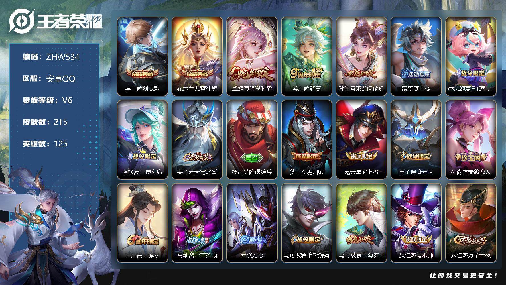 [12533658]【特价急出/详情看图/发育38段】:安卓Q-V6-永恒钻石III段位-125英雄-215皮肤-2典藏-3传说-64史诗 【英雄全皮】:戈娅全皮 【荣耀典藏】:李白鸣剑曳影,花木兰九霄神辉 【传说皮肤】:虞姬愿照岁时盈,桑启鸣野蒿,孙尚香乘龙问璇玑 【限定皮肤】:蒙犽顽岩魄,蔡文姬夏日便利店,虞姬夏日便利店,姜子牙天穹之誓,杨戬破阵退雄兵,狄仁杰阴阳师,赵云皇家上将,墨子神迹守卫,孙尚香蔷薇恋人,庄周高山流水,高渐离死亡摇滚,元歌无心,马可波罗暗影游猎,马可波罗山海玄木吟,狄仁杰魔术师,狄仁杰万华元夜,达摩沙漠行僧,项羽海滩派对,老夫子航海奇遇记,程咬金演武夺筹,李元芳云中旅人,钟馗驱傩正仪,杨玉环遇见飞天,干将莫邪胡桃夹子,雅典娜黎明之约,鬼谷子五谷丰年,苏烈千军破阵,百里玄策原初追逐者,梦奇顽趣,沈梦溪大漠名商,裴擒虎擒涛扼浪,嫦娥暖冬兔眠,西施玲珑珍味,鲁班大师探海日志,桑启海盐诗旅,暃星界游侠,戈娅驭风魔法,阿古朵江河有灵,张良古海寻踪,蒙犽百解令,蒙恬荣光圣徽,鬼谷子天穹祈灯,伽罗琥珀纪元,孙尚香乘龙问璇玑,沈梦溪龙舞盛年,刘邦剑破天穹,程咬金群星魔术团,周瑜熔金海岸 【年限皮肤】:马可波罗山海玄木吟,孙尚香乘龙问璇玑 【赛季限定】:狄仁杰万华元夜,达摩沙漠行僧,程咬金演武夺筹,张良古海寻踪,李元芳云中旅人,钟馗驱傩正仪,雅典娜黎明之约,苏烈千军破阵,百里玄策原初追逐者,梦奇顽趣,沈梦溪大漠名商,裴擒虎擒涛扼浪,鲁班大师探海日志,桑启海盐诗旅,鬼谷子天穹祈灯,蒙恬荣光圣徽,刘邦剑破天穹,姜子牙天穹之誓 【战令限定】:墨子神迹守卫,蔡文姬夏日便利店,虞姬夏日便利店,马可波罗暗影游猎,老夫子航海奇遇记,嫦娥暖冬兔眠,西施玲珑珍味,暃星界游侠,戈娅驭风魔法 【史诗皮肤】:露娜紫霞仙子,赵云皇家上将,貂蝉圣诞恋歌,甄姬冰雪圆舞曲,王昭君偶像歌手,狄仁杰魔术师,廉颇地狱岩魂,宫本武藏鬼剑武藏,孙尚香蔷薇恋人,孙尚香水果甜心,妲己魅力维加斯,妲己女仆咖啡,墨子金属风暴,吕布圣诞狂欢,曹操幽灵船长,李白千年之狐,吕布末日机甲,花木兰水晶猎龙者,刘邦德古拉伯爵,夏侯惇乘风破浪,小乔缤纷独角兽,百里守约特工魅影,铠曙光守护者,蔡文姬舞动绿茵,刘禅天才门将,李元芳逐浪之夏,程咬金功夫厨神,白起星夜王子,阿轲节奏热浪,杨玉环遇见飞天,伽罗箭羽风息,狄仁杰鹰眼统帅,孙尚香时之恋人