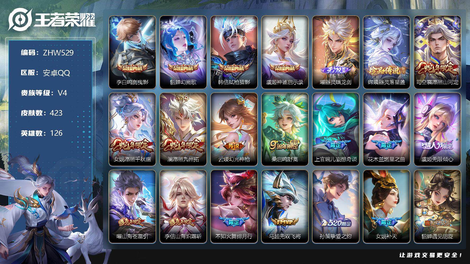 [12533694]【特价急出/详情看图】:安卓Q-V4-永恒钻石I段位-126英雄-423皮肤-4典藏-1无双-1珍品传说-32传说-125史诗