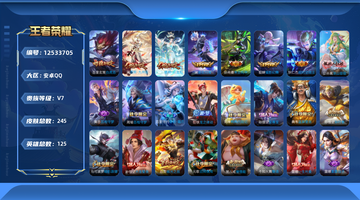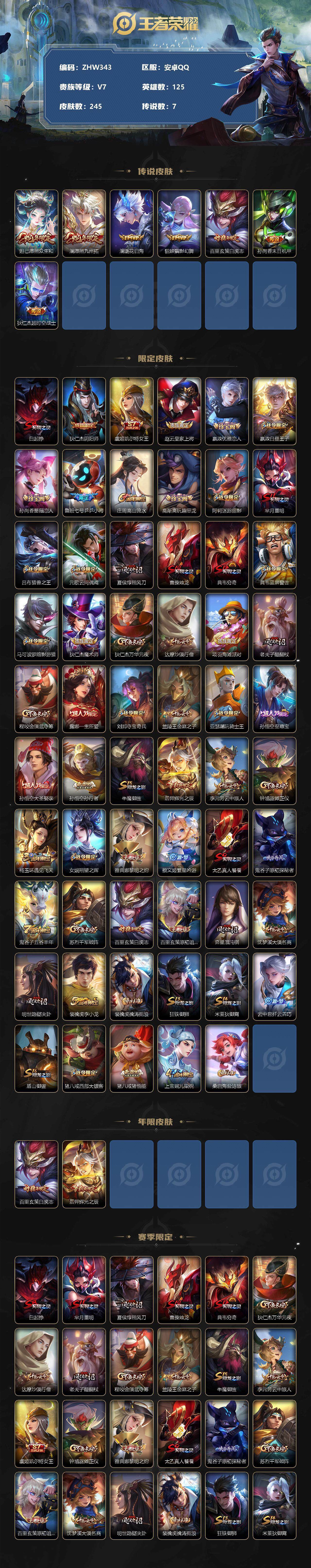 [12533705]【商品标题】:特价急出!安卓Q-V7-至尊星耀V段位-125英雄-245皮肤-0典藏-0珍品无双-0无双-0珍品传说-7传说-57史诗
