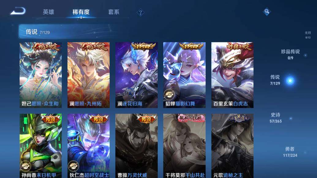 【传说皮肤】:妲己愿照众生和,澜愿照九州拓,澜逐花归海,貂蝉猫影幻舞,百里玄策白虎志,孙尚香末日机甲,狄仁杰超时空战士