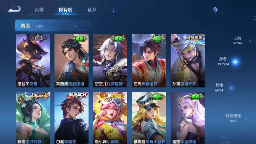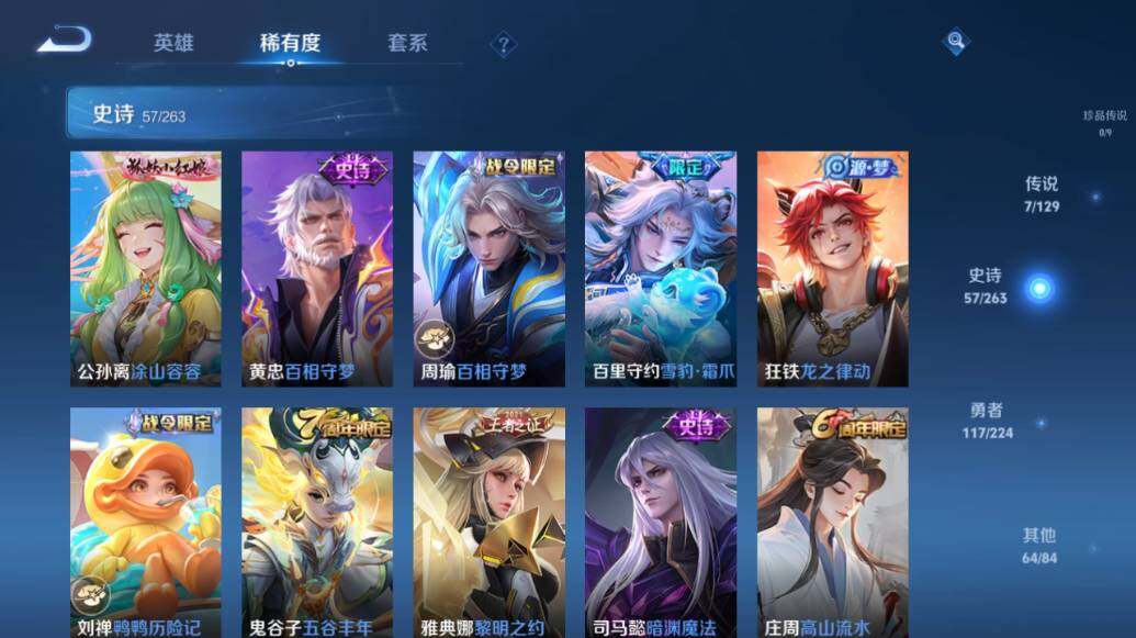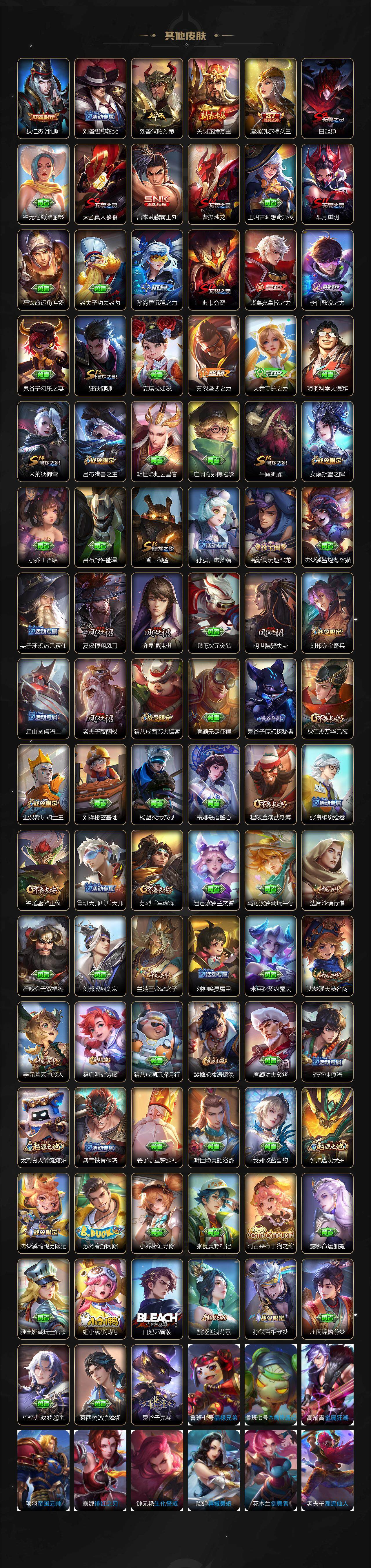 虞姬凯尔特女王,白起狰,太乙真人饕餮,曹操烛龙,芈月重明,典韦穷奇,狂铁御狮,米莱狄御霄,牛魔御旌,盾山御銮,夏侯惇朔风刀,明世隐疑决卦,老夫子醍醐杖,鬼谷子原初探秘者,狄仁杰万华元夜,程咬金演武夺筹,钟馗驱傩正仪,苏烈千军破阵,吕布猎兽之王,嬴政白昼王子,女娲朔望之晖,典韦蓝屏警告,刘邦夺宝奇兵,马可波罗暗影游猎,元歌云间偶戏,弈星混沌棋,达摩沙漠行僧,兰陵王金庭之子,沈梦溪大漠名商,李元芳云中旅人,桑启海盐诗旅,裴擒虎擒涛扼浪