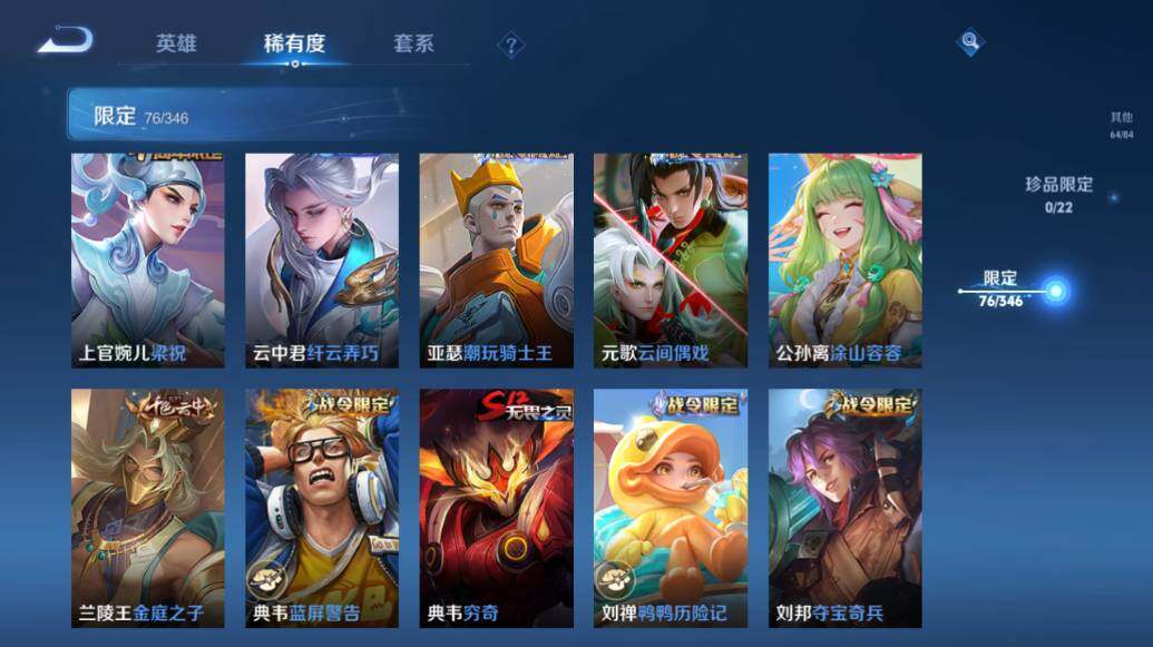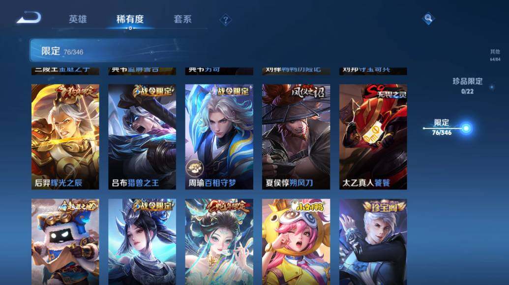 【赛季限定】:白起狰,芈月重明,夏侯惇朔风刀,曹操烛龙,典韦穷奇,狄仁杰万华元夜,达摩沙漠行僧,老夫子醍醐杖,程咬金演武夺筹,兰陵王金庭之子,牛魔御旌,李元芳云中旅人,虞姬凯尔特女王,钟馗驱傩正仪,雅典娜黎明之约,太乙真人饕餮,鬼谷子原初探秘者,苏烈千军破阵,百里玄策原初追逐者,弈星混沌棋,沈梦溪大漠名商,明世隐疑决卦,裴擒虎擒涛扼浪,狂铁御狮,米莱狄御霄,盾山御銮,桑启海盐诗旅