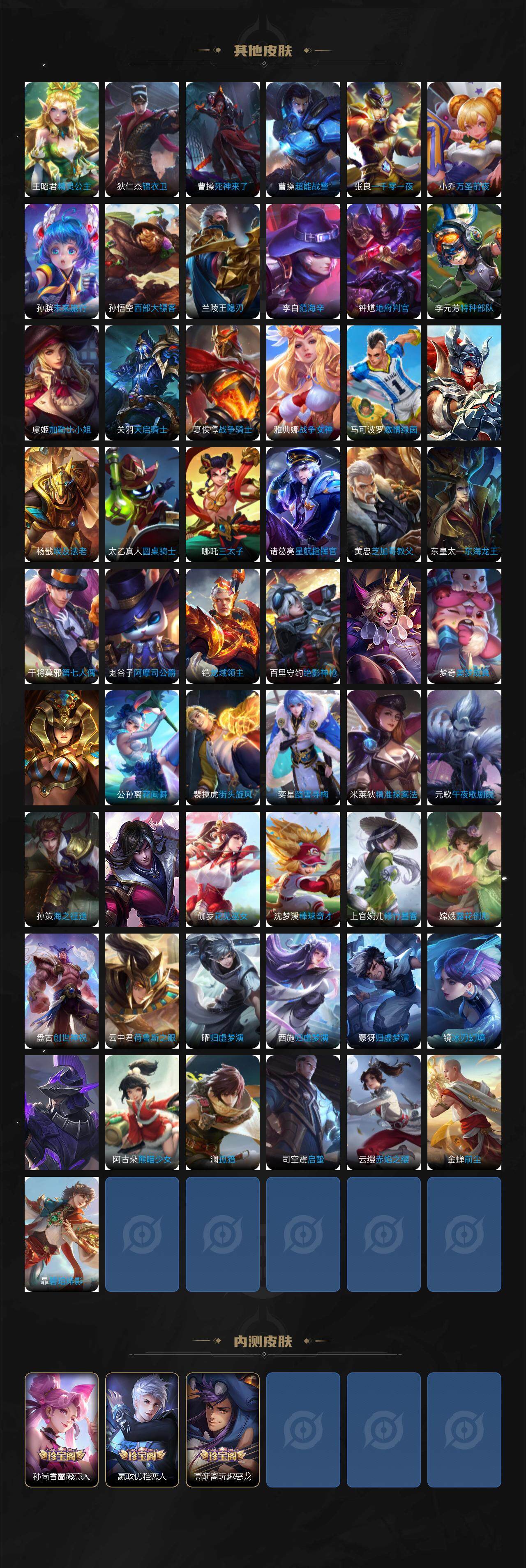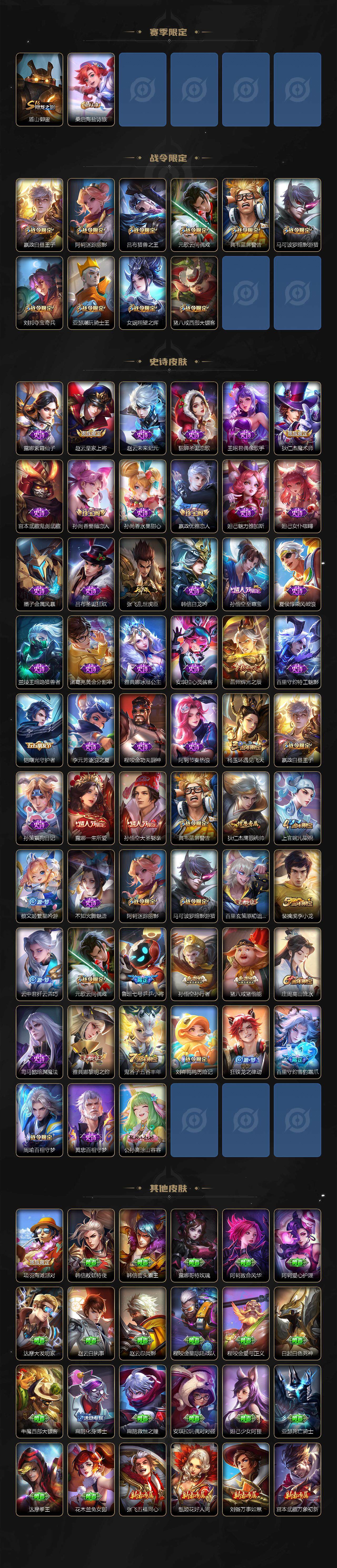 【限定皮肤】:白起狰,狄仁杰阴阳师,虞姬凯尔特女王,赵云皇家上将,嬴政优雅恋人,嬴政白昼王子,孙尚香蔷薇恋人,鲁班七号乒乒小将,庄周高山流水,高渐离玩趣恶龙,阿轲迷踪丽影,芈月重明,吕布猎兽之王,元歌云间偶戏,夏侯惇朔风刀,曹操烛龙,典韦穷奇,典韦蓝屏警告,马可波罗暗影游猎,狄仁杰魔术师,狄仁杰万华元夜,达摩沙漠行僧,项羽海滩派对,老夫子醍醐杖,程咬金演武夺筹,露娜一生所爱,刘邦夺宝奇兵,兰陵王金庭之子,亚瑟潮玩骑士王,孙悟空至尊宝,孙悟空大圣娶亲,孙悟空孙行者,牛魔御旌,后羿辉光之辰,李元芳云中旅人,钟馗驱傩正仪,杨玉环遇见飞天,女娲朔望之晖,雅典娜黎明之约,蔡文姬繁星吟游,太乙真人饕餮,鬼谷子原初探秘者,鬼谷子五谷丰年,苏烈千军破阵,百里玄策白虎志,百里玄策原初追逐者,弈星混沌棋,沈梦溪大漠名商,明世隐疑决卦,裴擒虎李小龙,裴擒虎擒涛扼浪,狂铁御狮,米莱狄御霄,云中君纤云弄巧,盾山御銮,猪八戒西部大镖客,猪八戒猪悟能,上官婉儿梁祝,桑启海盐诗旅