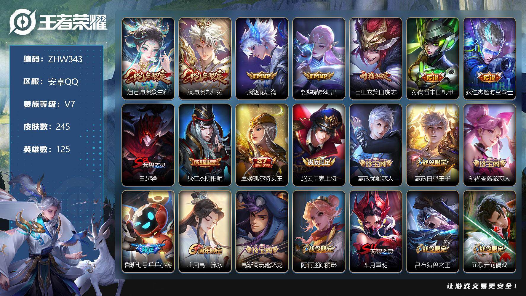 [12533705]【商品标题】:特价急出!安卓Q-V7-至尊星耀V段位-125英雄-245皮肤-0典藏-0珍品无双-0无双-0珍品传说-7传说-57史诗 【英雄全皮】:空空儿全皮 【传说皮肤】:妲己愿照众生和,澜愿照九州拓,澜逐花归海,貂蝉猫影幻舞,百里玄策白虎志,孙尚香末日机甲,狄仁杰超时空战士 【限定皮肤】:白起狰,狄仁杰阴阳师,虞姬凯尔特女王,赵云皇家上将,嬴政优雅恋人,嬴政白昼王子,孙尚香蔷薇恋人,鲁班七号乒乒小将,庄周高山流水,高渐离玩趣恶龙,阿轲迷踪丽影,芈月重明,吕布猎兽之王,元歌云间偶戏,夏侯惇朔风刀,曹操烛龙,典韦穷奇,典韦蓝屏警告,马可波罗暗影游猎,狄仁杰魔术师,狄仁杰万华元夜,达摩沙漠行僧,项羽海滩派对,老夫子醍醐杖,程咬金演武夺筹,露娜一生所爱,刘邦夺宝奇兵,兰陵王金庭之子,亚瑟潮玩骑士王,孙悟空至尊宝,孙悟空大圣娶亲,孙悟空孙行者,牛魔御旌,后羿辉光之辰,李元芳云中旅人,钟馗驱傩正仪,杨玉环遇见飞天,女娲朔望之晖,雅典娜黎明之约,蔡文姬繁星吟游,太乙真人饕餮,鬼谷子原初探秘者,鬼谷子五谷丰年,苏烈千军破阵,百里玄策白虎志,百里玄策原初追逐者,弈星混沌棋,沈梦溪大漠名商,明世隐疑决卦,裴擒虎李小龙,裴擒虎擒涛扼浪,狂铁御狮,米莱狄御霄,云中君纤云弄巧,盾山御銮,猪八戒西部大镖客,猪八戒猪悟能,上官婉儿梁祝,桑启海盐诗旅 【年限皮肤】:百里玄策白虎志,后羿辉光之辰 【赛季限定】:白起狰,芈月重明,夏侯惇朔风刀,曹操烛龙,典韦穷奇,狄仁杰万华元夜,达摩沙漠行僧,老夫子醍醐杖,程咬金演武夺筹,兰陵王金庭之子,牛魔御旌,李元芳云中旅人,虞姬凯尔特女王,钟馗驱傩正仪,雅典娜黎明之约,太乙真人饕餮,鬼谷子原初探秘者,苏烈千军破阵,百里玄策原初追逐者,弈星混沌棋,沈梦溪大漠名商,明世隐疑决卦,裴擒虎擒涛扼浪,狂铁御狮,米莱狄御霄,盾山御銮,桑启海盐诗旅 【战令限定】:嬴政白昼王子,阿轲迷踪丽影,吕布猎兽之王,元歌云间偶戏,典韦蓝屏警告,马可波罗暗影游猎,刘邦夺宝奇兵,亚瑟潮玩骑士王,女娲朔望之晖,猪八戒西部大镖客 【史诗皮肤】:露娜紫霞仙子,赵云皇家上将,赵云未来纪元,貂蝉圣诞恋歌,王昭君偶像歌手,狄仁杰魔术师,宫本武藏鬼剑武藏,孙尚香蔷薇恋人,孙尚香水果甜心,嬴政优雅恋人,妲己魅力维加斯,妲己女仆咖啡,墨子金属风暴,吕布圣诞狂欢,张飞乱世虎臣,韩信白龙吟,孙悟空至尊宝,