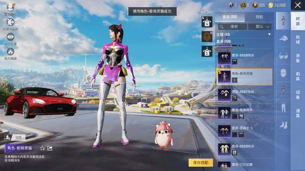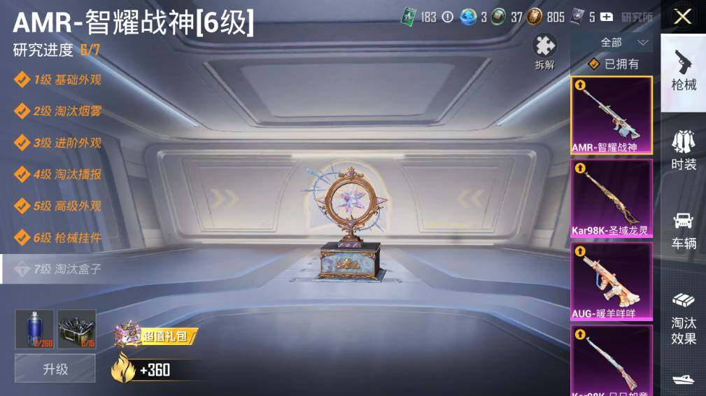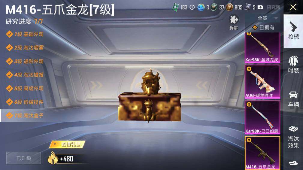 【粉色枪皮等级】:M416-五爪金龙(七级),AUG-暖羊咩咩(五级),Kar98K-巳巳如意(五级),Kar98K-圣域龙灵(三级),AMR-智耀战神(六级)