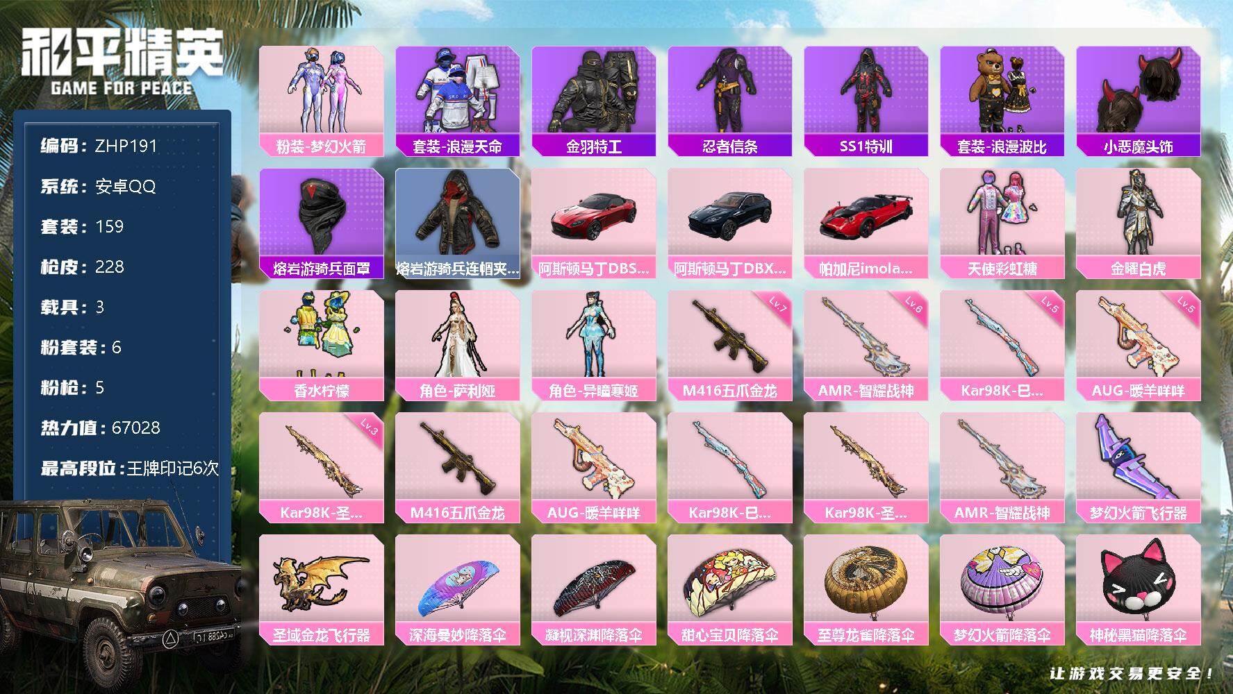 [12533710]【商品标题】:特价急出!安卓 手Q-6粉装-5特效枪-3载具-2粉色飞行器-67028热力值-6王牌印记-159套装-228枪皮