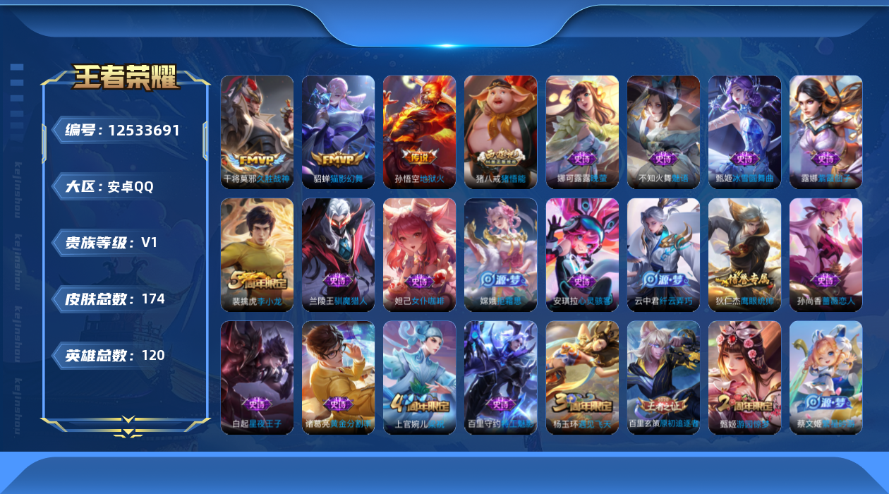[12533691]【特价急出/详情看图】:安卓Q-V0-尊贵铂金II段位-120英雄-174皮肤-3传说-39史诗 【英雄全皮】:影全皮 【传说皮肤】:貂蝉猫影幻舞,干将莫邪久胜战神,孙悟空地狱火 【限定皮肤】:白起狰,姜子牙天穹之誓,狄仁杰阴阳师,虞姬凯尔特女王,赵云皇家上将,孙尚香蔷薇恋人,鲁班七号狮舞东方,庄周高山流水,高渐离死亡摇滚,孙膑妖精王,扁鹊炼金王,芈月重明,周瑜赤莲之焰,夏侯惇朔风刀,甄姬游园惊梦,曹操烛龙,典韦穷奇,狄仁杰魔术师,狄仁杰万华元夜,达摩沙漠行僧,项羽海滩派对,老夫子醍醐杖,程咬金演武夺筹,兰陵王驯魔猎人,兰陵王金庭之子,牛魔御旌,李元芳云中旅人,钟馗神迹守卫,钟馗驱傩正仪,杨玉环遇见飞天,雅典娜单词大作战,雅典娜黎明之约,蔡文姬繁星吟游,太乙真人饕餮,鬼谷子原初探秘者,苏烈千军破阵,百里玄策原初追逐者,弈星混沌棋,明世隐疑决卦,裴擒虎李小龙,狂铁御狮,米莱狄御霄,云中君纤云弄巧,盾山御銮,猪八戒猪悟能,上官婉儿梁祝,嫦娥拒霜思,蒙犽狂想玩偶喵,桑启海盐诗旅,张良古海寻踪,周瑜熔金海岸 【赛季限定】:孙膑妖精王,扁鹊炼金王,白起狰,芈月重明,夏侯惇朔风刀,曹操烛龙,典韦穷奇,狄仁杰万华元夜,达摩沙漠行僧,老夫子醍醐杖,程咬金演武夺筹,兰陵王金庭之子,张良古海寻踪,牛魔御旌,李元芳云中旅人,虞姬凯尔特女王,钟馗驱傩正仪,雅典娜黎明之约,太乙真人饕餮,鬼谷子原初探秘者,苏烈千军破阵,百里玄策原初追逐者,弈星混沌棋,明世隐疑决卦,狂铁御狮,米莱狄御霄,盾山御銮,桑启海盐诗旅,姜子牙天穹之誓 【战令限定】:鲁班七号狮舞东方,周瑜赤莲之焰,兰陵王驯魔猎人,钟馗神迹守卫,雅典娜单词大作战,蒙犽狂想玩偶喵 【史诗皮肤】:露娜紫霞仙子,赵云皇家上将,貂蝉圣诞恋歌,甄姬冰雪圆舞曲,狄仁杰魔术师,廉颇地狱岩魂,宫本武藏鬼剑武藏,孙尚香蔷薇恋人,孙尚香水果甜心,嬴政摇滚巨星,妲己魅力维加斯,妲己女仆咖啡,墨子金属风暴,吕布圣诞狂欢,张飞乱世虎臣,小乔缤纷独角兽,诸葛亮黄金分割率,甄姬游园惊梦,安琪拉心灵骇客,百里守约特工魅影,李元芳逐浪之夏,白起星夜王子,杨玉环遇见飞天,孙策猫狗日记,鲁班七号狮舞东方,狄仁杰鹰眼统帅,兰陵王驯魔猎人,上官婉儿梁祝,蔡文姬繁星吟游,娜可露露晚萤,不知火舞魅语,蒙犽狂想玩偶喵,百里玄策原初追逐者,裴擒虎李小龙,云中君纤云弄巧,猪八戒猪悟能,庄