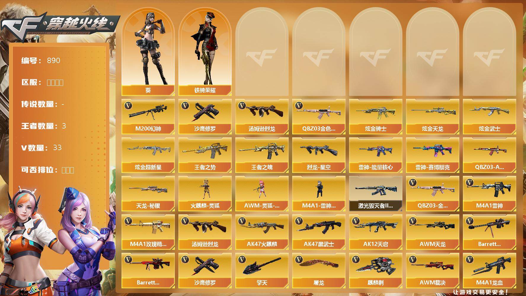 [12545310]【商品标题】:重庆一区-33V-3王者-4炫金 【热门武器】:QBZ03-金色蔷薇,M200-幻神,汤姆逊-烈龙*2,沙鹰-修罗*2 【王者炫金武器】:炫金骑士,炫金天龙,炫金武士,炫金超新星,王者之势,王者之魄 【稀有皮肤】:QBZ03-AG-CFPLS19冠军,雷神-能量核心,雷神-赛博朋克,天龙-秘银,烈龙-星空 【角色】:葵,铁骑荣耀 【人偶武器】:火麒麟-灵狐,AWM-灵狐-15周年嘉年华,M4A1-雷神-精英刀锋 【挑战大师】:激光毁灭者III-白马银枪 【英雄级武器】:烟雾弹-竞技荣光,闪光弹-竞技荣光,AK47-雷暴,斩神刀-雷暴,QBZ03-金色蔷薇,无影-神兵利器,M4A1-雷神*2,M4A1-玫瑰精灵,汤姆逊-烈龙*2,AK47-火麒麟,AK47-黑武士,AK12-天启,AWM-天龙,Barrett-毁灭,Barrett-极光*2,AWM-裁决,M4A1-龙血,M200-幻神,M4A1-千变,黑武士-锦绣游龙,沙鹰-修罗*2,麒麟刺,擎天,屠龙*2 【特殊枪械】:0白虎,0黑骑士,2烈龙,0盘龙,0炼狱,0蝴蝶斯泰尔