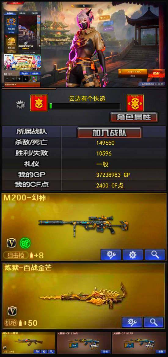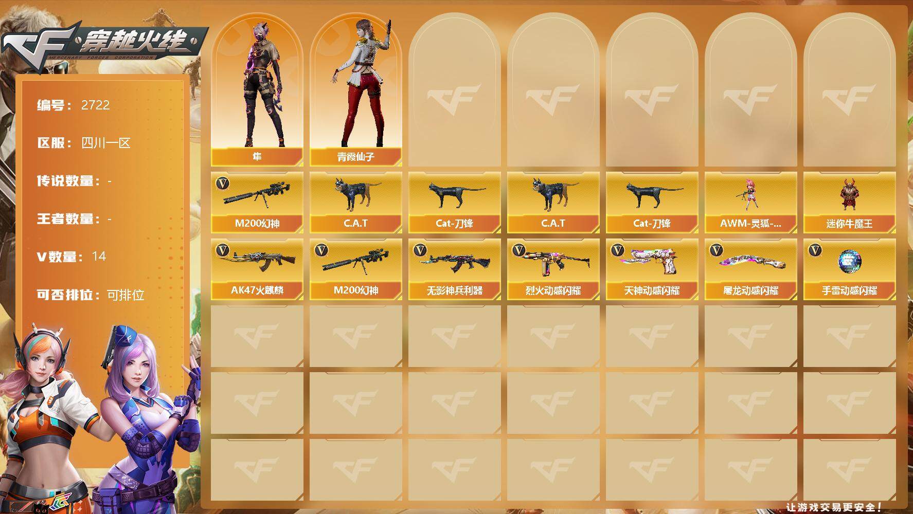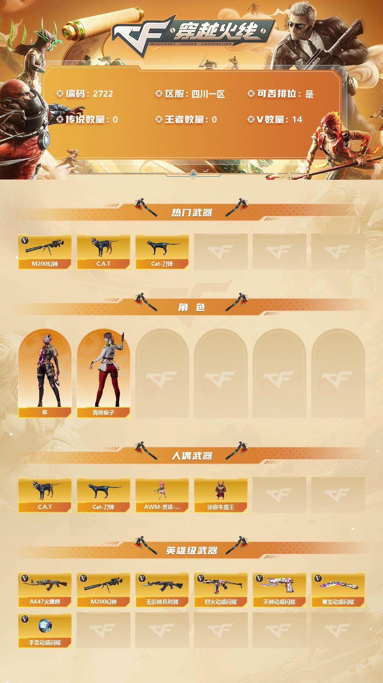 [12545533]【商品标题】:四川一区-14V-0王者-0炫金 【热门武器】:M200-幻神,C.A.T,Cat-刀锋 【角色】:隼,青霞仙子 【人偶武器】:AWM-灵狐-15周年嘉年华,C.A.T,Cat-刀锋,迷你牛魔王 【英雄级武器】:烈火-动感闪耀,天神-动感闪耀,屠龙-动感闪耀,手雷-动感闪耀,无影-神兵利器,AK47-火麒麟,M200-幻神 【特殊枪械】:
