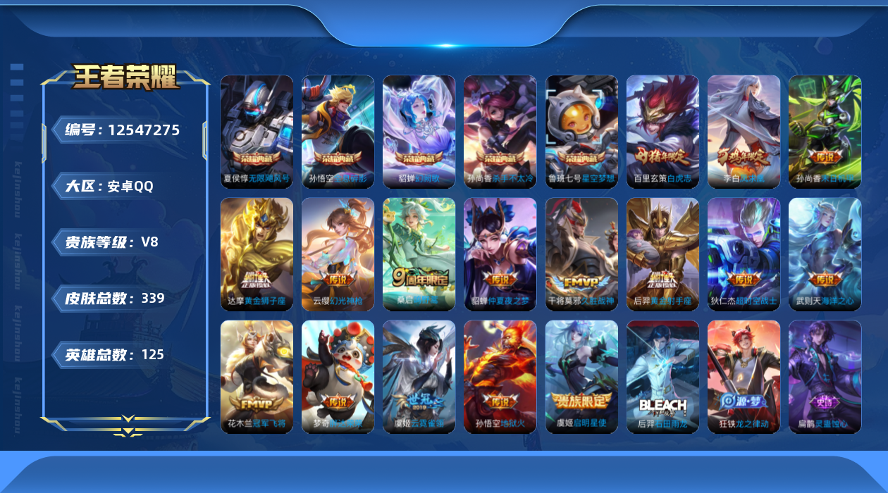 [12547275]【商品标题】:安卓Q-V8-至尊星耀III段位-125英雄-339皮肤-5典藏-0珍品无双-0无双-0珍品传说-16传说-93史诗