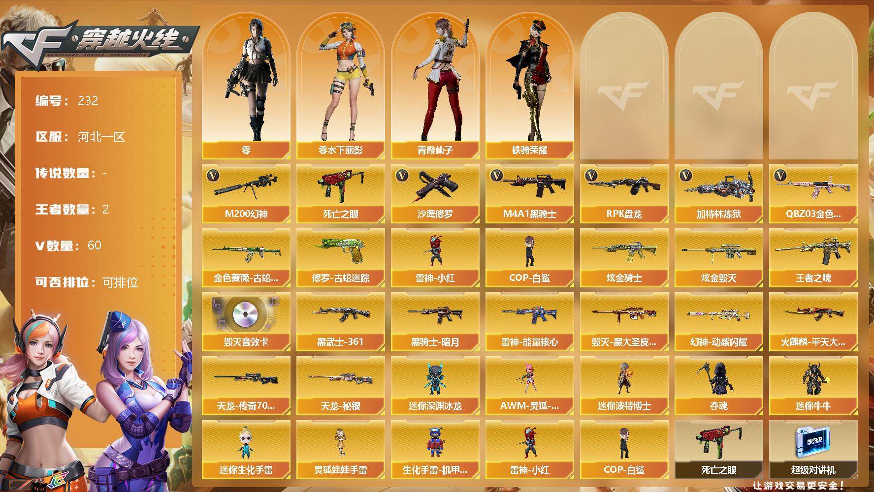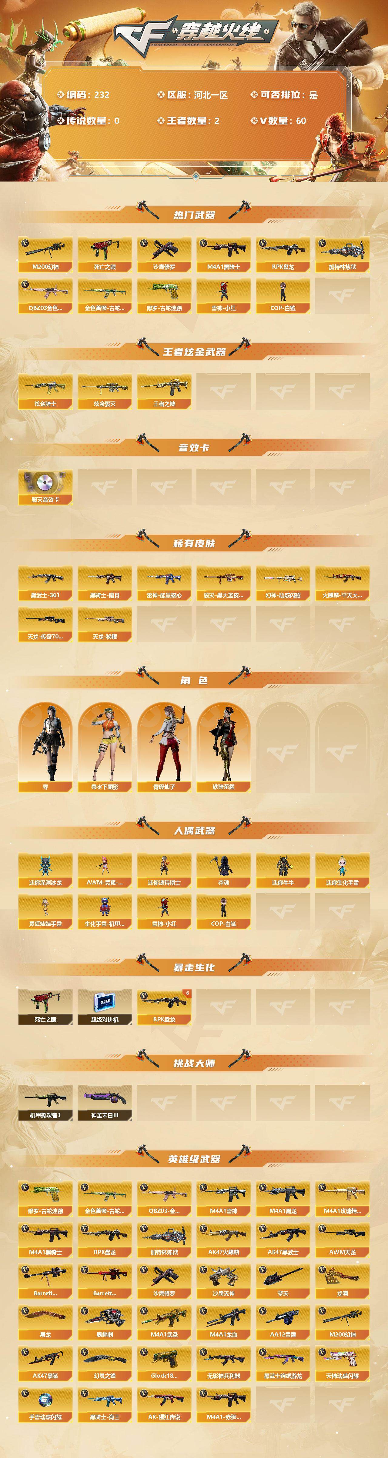 [12547504]【232】58V/102级/荣耀元首/2王者/4炫金/2英雄/QBZ03-金色蔷薇/M200-幻神/金色蔷薇-古蛇迷踪/修罗-古蛇迷踪/死亡之眼/M4A1-黑骑士/RPK-盘龙/加特林-炼狱/雷神-小红/COP-白鲨/沙鹰-修罗/炫金黑骑士/炫金毁灭/王者之魄/Barrett-毁灭音效卡/幻神动感闪耀/雷神-能量核心/火麒麟-平天大圣/黑骑士-暗月/毁灭-黑大圣皮肤/天龙-秘银/AWM-天龙-传奇70KG/AK47-黑武士-361/零-水下丽影/零/铁骑荣耀/青霞仙子/AWM-灵狐-15周年嘉年华/迷你深渊冰龙/迷你波特博士/夺魂/迷你牛牛/迷你生化手雷/灵狐娃娃手雷/生化手雷-机甲核心/超级对讲机/6盘龙/机甲撕裂者/神圣爆裂者-末日/幻灵之锋/M4A1-武圣/Glock18-武圣/天神-动感闪耀/手雷-动感闪耀/无影-神兵利器/M4A1-雷神/M4A1-黑龙/M4A1-玫瑰精灵/AK47-火麒麟/AK47-黑武士/AWM-天龙/Barrett-毁灭/Barrett-极光/M4A1-龙血/AA-12-雷霆/AK47-黑鲨/AK47-黑武士-锦绣游龙/黑骑士-海王/AK-47-猩红传说/M4A1-赤狱骑士/沙鹰-天神/麒麟刺/擎天/龙啸/屠龙