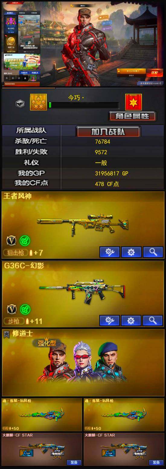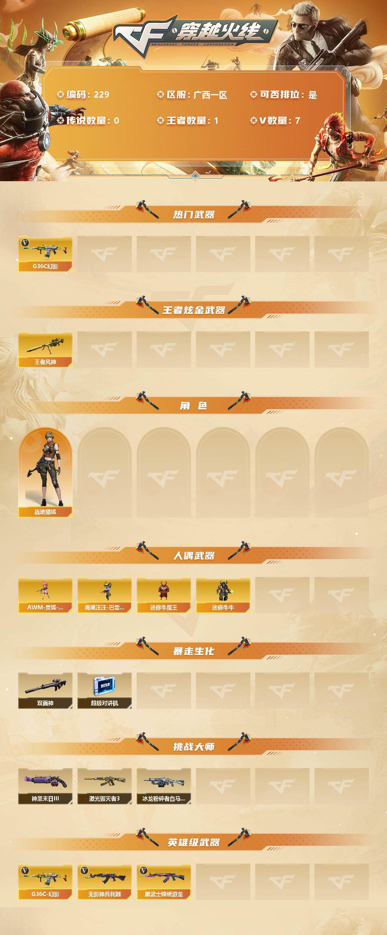 - [13003183]浙江一区-53V-13王者-1炫金 【热门武器】:QBZ03-金色蔷薇,M200-幻神,死亡之眼,M4A1-黑骑士*5,汤姆逊-烈龙*7,RPK-盘龙*6,加特林-炼狱,沙鹰-修罗*4 【王者炫金武器】:炫金天龙,王者之鲨,王者之光,王者之怒,王者之锋,王者玉锋 【音效卡】:AK47-火麒麟音效卡,M4A1-雷神音效卡,Barrett-毁灭音效卡 【稀有皮肤】:幻神-丹凤,星神-漫游,雷神-荣耀之魄,雷神-星空*2,雷神-耀金皮肤,黑骑士-暗月*2,毁灭-荣耀之怒,毁灭耀金皮肤*2,天龙-能量核心,AWM-天龙-传奇70KG,烈龙-星空,屠龙-荣耀之锋,屠龙-春桃 皮肤 【角色】:王者春,王者潘多拉,零-水下丽影,樱,战地猎狐,新灵狐者,铁骑荣耀 【人偶武器】:AWM-灵狐-15周年嘉年华,M37-葵,迷你深渊冰龙,迷你裂空之翼,迷你波特博士,迷你火种,迷你生化手雷 【暴走生化】:死亡之眼 【挑战大师】:神圣爆裂者III,KAC-圣炎切割者III,惩戒者III,试炼破坏者III,激光毁灭者III,激光毁灭者III-白马银枪 【英雄级武器】:QBZ03-金色蔷薇,M4A1-雷神*2,M4A1-黑龙,M4A1-黑骑士*5,RPK-盘龙*6,加特林-炼狱,汤姆逊-烈龙*7,AK47-火麒麟*2,AK12-天启,AN94-超新星,AWM-天龙*3,Barrett-毁灭,M200-幻神,M4A1-猎神,AK47-B-战神,沙鹰-修罗*4,麒麟刺,龙啸,屠龙 【特殊枪械】:5黑骑士,6烈龙,6盘龙,1炼狱