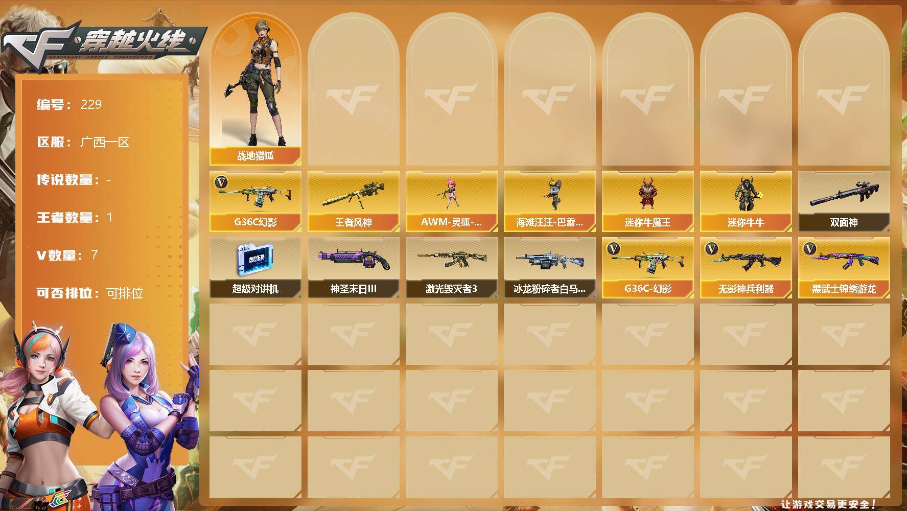 [12547950]【229】6V/100级/元帅/1王者/1英雄/G36C-幻影/王者风神/战地猎狐/AWM-灵狐-15周年嘉年华/海滩汪汪-巴雷特/迷你牛魔王/迷你牛牛/双面神/超级对讲机/神圣爆裂者-末日/激光毁灭者/冰龙粉碎者-白马银枪/无影-神兵利器/AK47-黑武士-锦绣游龙
