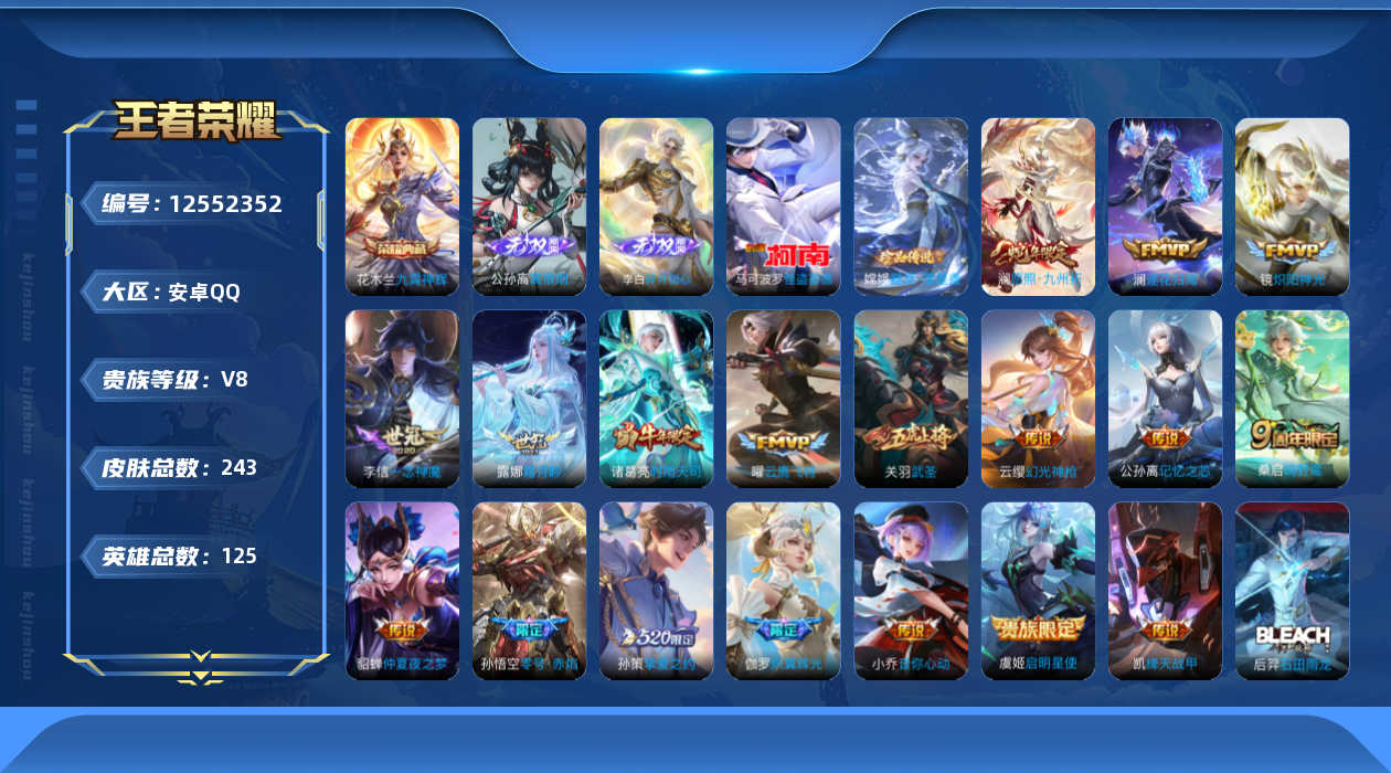 - [11253365]V9 2典藏 1珍品无双 1无双 3珍品传说 37传说 125英雄 384皮肤 可修改实名 女号 优质装备:馥梦繁花,鸣剑·曳影,九霄神辉(木兰典藏),天机白泽,江户川柯南,怪盗基德,酷洛米之心,冠军飞将,云鹰飞将(小将军),绛天战甲(鸡嘴战神),久胜战神,炽阳神光,一念神魔,云霓雀翎,末日机甲-孙尚香(绿蚂蚱),地狱火,仲夏夜之梦(大飞蛾),零号·赤焰,李逍遥,乞巧织情,游龙清影(小青龙),淬星耀世,超时空战士-狄仁杰,无双飞将,碎云,山海·炽霜斩(李信年限),画中仙,浮生妄,鹤羽星尊,澜逐花归海,玄雷天君 传说皮:落雪白狼 珍宝阁皮:优雅恋人,女武神 限定皮:愿照·九州拓(澜年限),陌上桑,鸣野蒿,太华(伽罗年限),武陵仙君(小桃花),异界灵契(白毛香),傲雪梅枪,星穹之声,时之彼端,白晶晶,时雨天司(水龙头),神威(电光马子),遇见飞天,高山流水,诗剑行,五谷丰年,冰锋战神,天狼运算者,游园惊梦,梁祝,御风骁将(吕布年限),逐梦之星,天狼溯光者,祈雪灵祝(雪兔子),霸王别姬-虞姬,默契交锋-花木兰,一生所爱,大圣娶亲,引擎之心,云端筑梦师,时之祈愿-云中君,时之祈愿-瑶(瑶传限),启示之音,山海·玄木吟(马可年限) 史诗皮:赞萌露比,鸭鸭历险记-刘禅,狼魂孤将,绮世丹青,龙之律动,百相守梦-周瑜,戍鼓铭心,幻珠鲛人,破空之剑,东方月初,谪仙醉月,百相守梦-百里守约,守夜人,遇见神鹿,紫霞仙子,电玩小子(小书包),白龙吟,黄金分割率,特工魅影,千年之狐,永昼,电玩·爆裂旋风,江河有灵,蒙恬荣光圣徽,偶像歌手,白蛇,暗夜猫娘,魅语,无限星赏官,晚萤,冰冠公主,青蛇,末日机甲-吕布,猫狗日记-孙策,猫狗日记-大乔,时之恋人-孙尚香,乱世虎臣,节奏热浪,修罗,女仆咖啡,摇滚巨星,水果甜心,绅士熊喵,天才门将,星夜王子,心灵骇客,功夫厨神,德古拉伯爵,暗隐猎兽者,幽灵船长,鬼剑武藏,暗渊魔法,心灵战警,天秀·启明,舞动绿茵,地狱岩魂,诗语江南,纤云弄巧,繁星吟游(呼啦呼啦),拒霜思,缤纷独角兽,乘风破浪,逐浪之夏,水晶猎龙者,曙光守护者,热力回旋,箭羽风息,唤灵魅影,金属风暴,原初追逐者,圣诞狂欢,圣诞恋歌,鹰眼统帅,暗夜贵公子,魅力维加斯,黎明之约,赏金猎手,无心,未来纪元-赵云