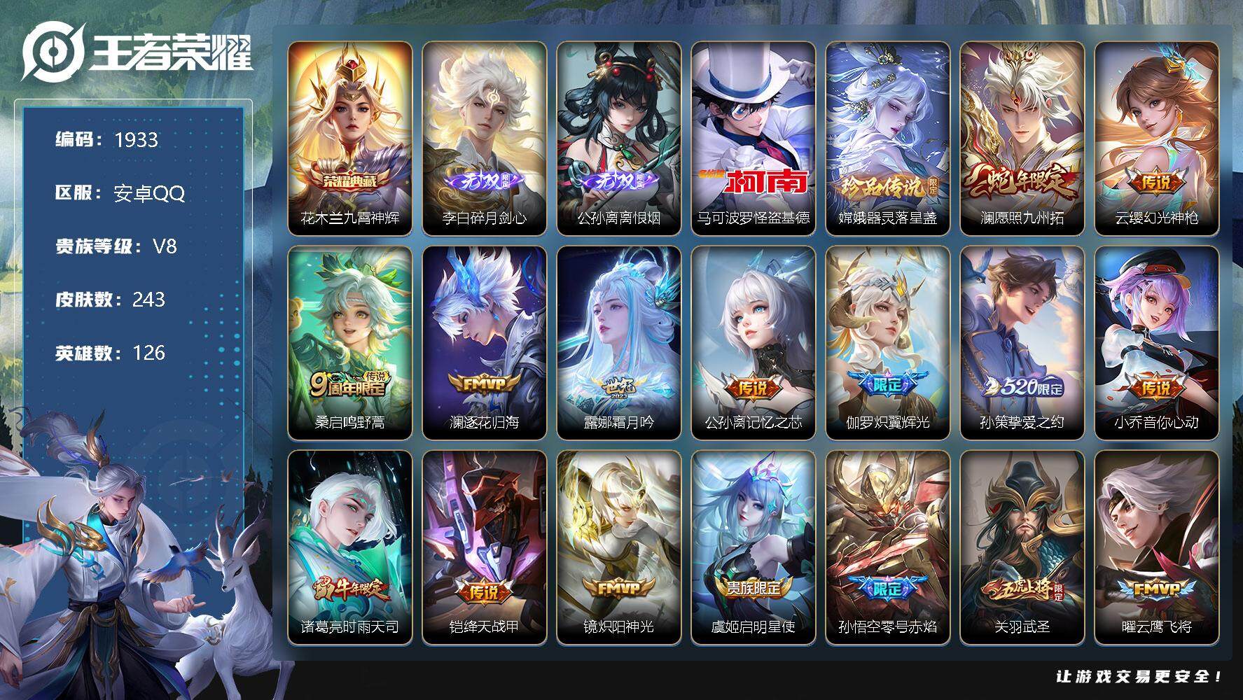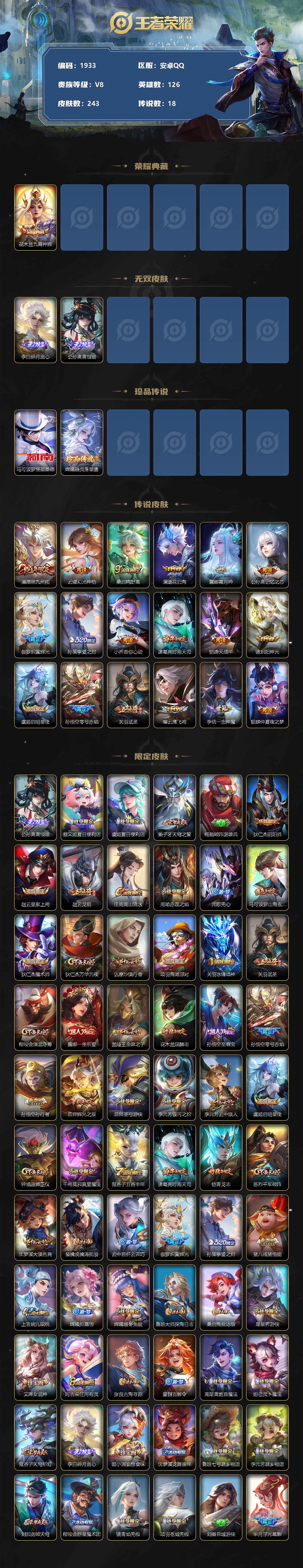 [12552352]【商品标题】:安卓Q-V8-永恒钻石IV段位-126英雄-243皮肤-1典藏-0珍品无双-2无双-2珍品传说-18传说-73史诗
