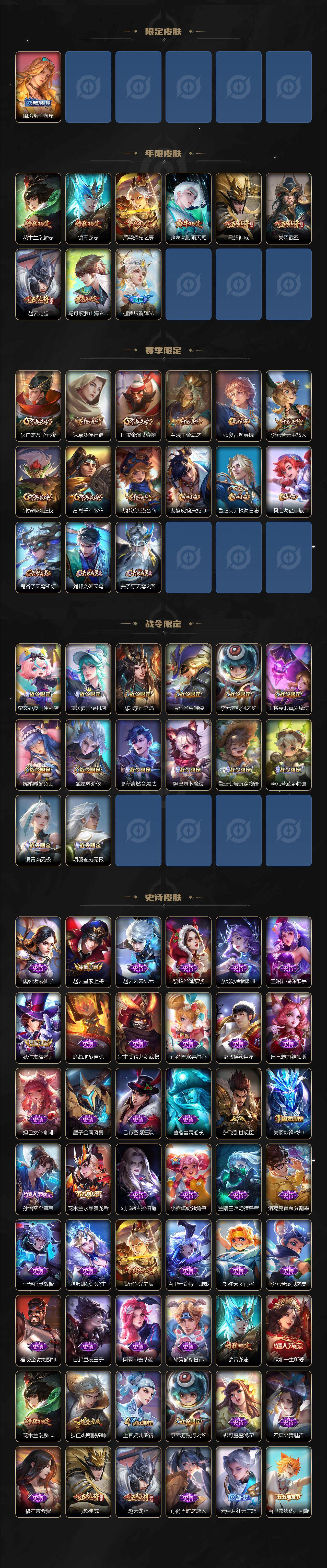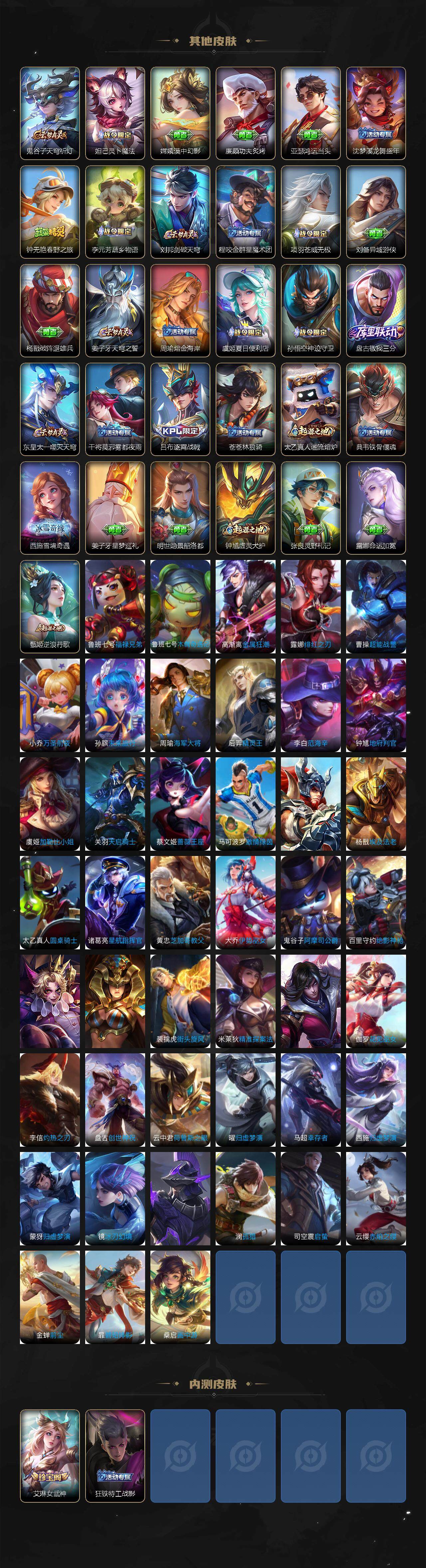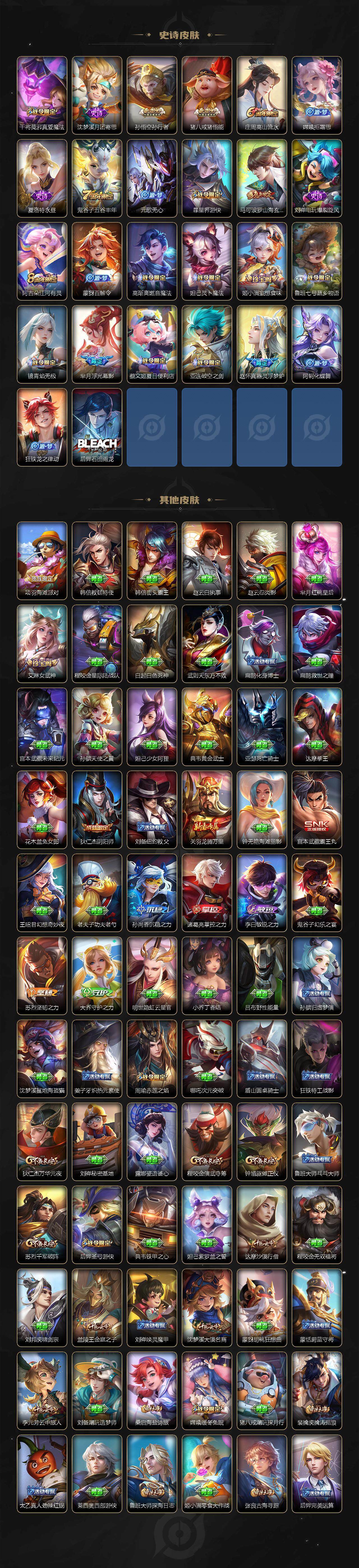 【限定皮肤】:公孙离离恨烟,蔡文姬夏日便利店,虞姬夏日便利店,姜子牙天穹之誓,杨戬破阵退雄兵,狄仁杰阴阳师,赵云皇家上将,赵云龙胆,庄周高山流水,周瑜赤莲之焰,元歌无心,马可波罗山海玄木吟,狄仁杰魔术师,狄仁杰万华元夜,达摩沙漠行僧,项羽海滩派对,关羽冰锋战神,关羽武圣,程咬金演武夺筹,露娜一生所爱,兰陵王金庭之子,花木兰瑞麟志,孙悟空至尊宝,孙悟空零号赤焰,孙悟空孙行者,后羿辉光之辰,后羿圣弓游侠,李元芳银河之约,李元芳云中旅人,虞姬启明星使,钟馗驱傩正仪,干将莫邪真爱魔法,鬼谷子五谷丰年,诸葛亮时雨天司,铠青龙志,苏烈千军破阵,沈梦溪大漠名商,裴擒虎擒涛扼浪,云中君纤云弄巧,伽罗炽翼辉光,孙策挚爱之约,猪八戒猪悟能,上官婉儿梁祝,嫦娥拒霜思,嫦娥暖冬兔眠,鲁班大师探海日志,桑启海盐诗旅,暃星界游侠,艾琳女武神,阿古朵江河有灵,张良古海寻踪,蒙犽百解令,高渐离燃音魔法,妲己灵卜魔法,鬼谷子天穹祈灯,李白碎月剑心,姬小满妄想食味,沈梦溪龙舞盛年,鲁班七号蔬乡物语,李元芳蔬乡物语,刘邦剑破天穹,程咬金群星魔术团,镜青焰无极,项羽苍威无极,刘备异域游侠,芈月浮光幕影,周瑜熔金海岸