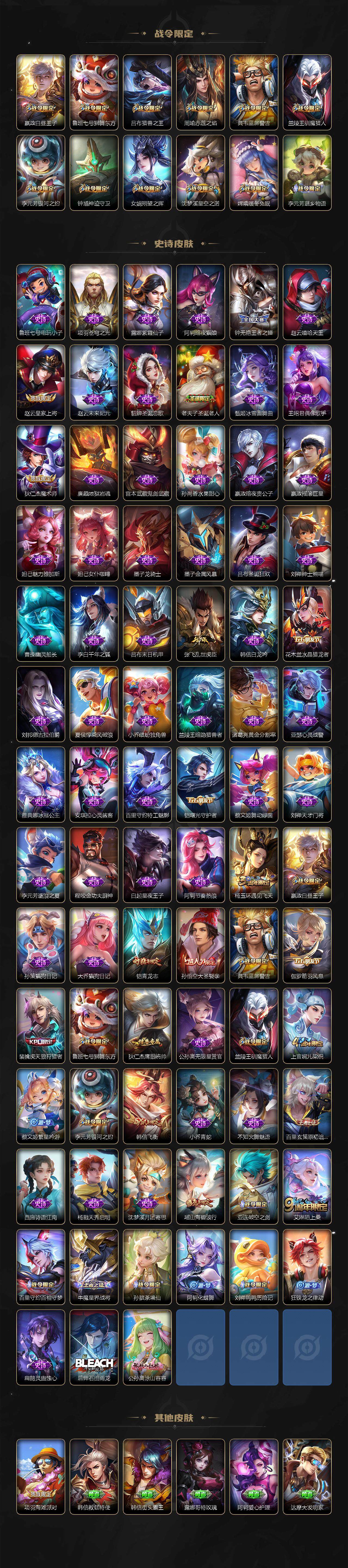 【限定皮肤】:狄仁杰阴阳师,赵云皇家上将,嬴政白昼王子,鲁班七号狮舞东方,高渐离死亡摇滚,高渐离玩趣恶龙,钟无艳王者之锤,芈月重明,吕布猎兽之王,周瑜赤莲之焰,夏侯惇朔风刀,典韦穷奇,典韦蓝屏警告,狄仁杰魔术师,项羽海滩派对,老夫子圣诞老人,程咬金演武夺筹,韩信飞衡,兰陵王驯魔猎人,孙悟空大圣娶亲,牛魔御旌,李元芳银河之约,虞姬启明星使,钟馗神迹守卫,钟馗驱傩正仪,杨玉环遇见飞天,女娲朔望之晖,蔡文姬繁星吟游,太乙真人华丽摇滚,铠青龙志,百里玄策原初追逐者,弈星混沌棋,沈梦溪星空之诺,明世隐疑决卦,裴擒虎天狼狩猎者,狂铁御狮,米莱狄御霄,瑶山海碧波行,盾山御銮,上官婉儿梁祝,嫦娥暖冬兔眠,鲁班大师探海日志,张良古海寻踪,鬼谷子天穹祈灯,李元芳蔬乡物语,刘邦剑破天穹