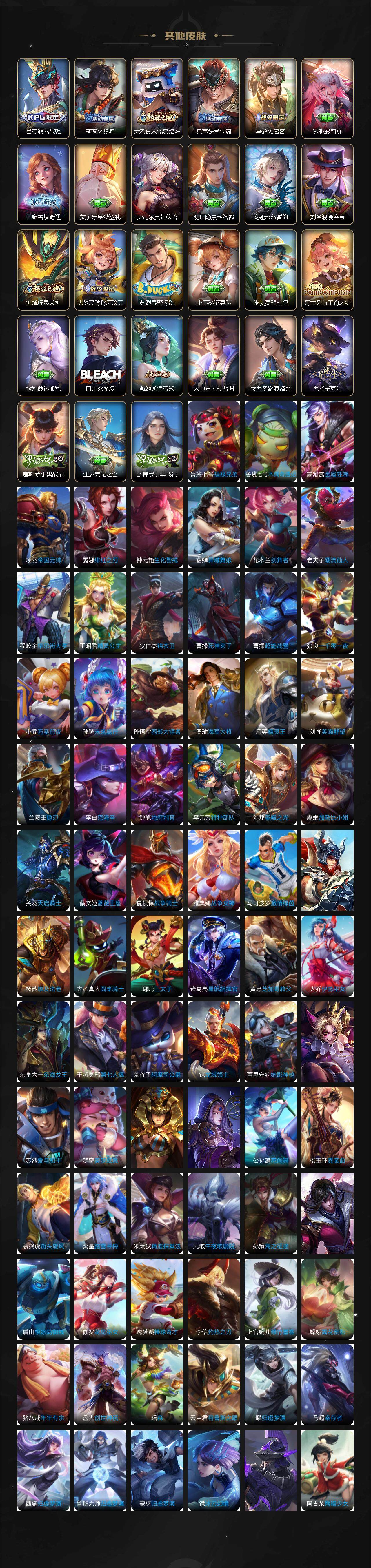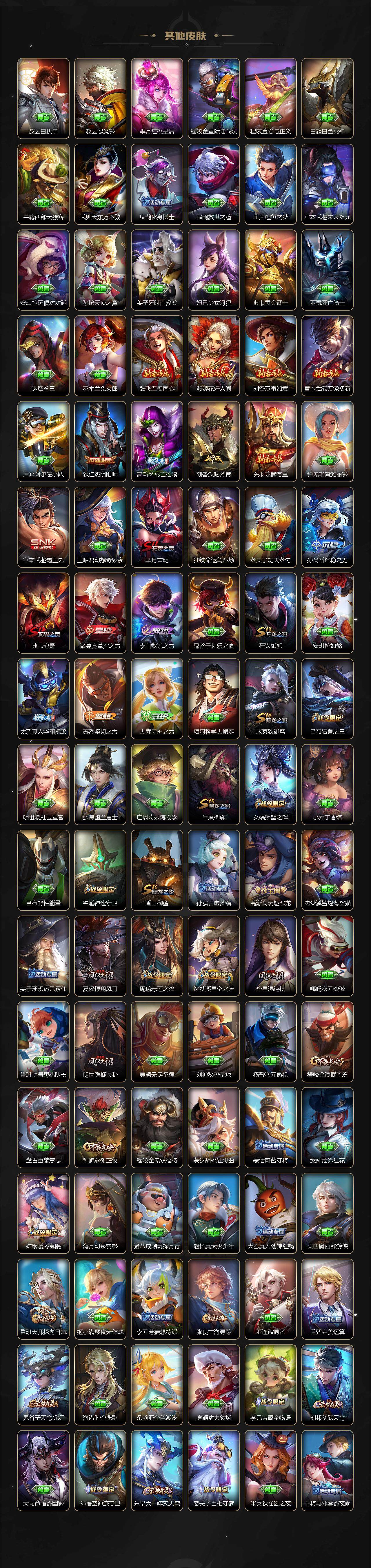 小乔青蛇,伽罗箭羽风息,李元芳逐浪之夏,不知火舞魅语,公孙离无限星赏官,大乔猫狗日记,孙策猫狗日记,阿轲节奏热浪,露娜紫霞仙子,诸葛亮黄金分割率,王昭君偶像歌手,韩信白龙吟,项羽苍穹之光,阿轲暗夜猫娘,雅典娜冰冠公主,吕布末日机甲,鲁班七号电玩小子,墨子龙骑士,嬴政摇滚巨星,刘禅绅士熊喵,刘禅天才门将,白起星夜王子,安琪拉心灵骇客,程咬金功夫厨神,刘邦德古拉伯爵,兰陵王暗隐猎兽者,曹操幽灵船长,宫本武藏鬼剑武藏,亚瑟心灵战警,杨戬天秀·启明,蔡文姬舞动绿茵,廉颇地狱岩魂,西施诗语江南,小乔缤纷独角兽,夏侯惇乘风破浪,花木兰水晶猎龙者,铠曙光守护者,墨子金属风暴,百里玄策原初追逐者,吕布圣诞狂欢,貂蝉圣诞恋歌,百里守约特工魅影,嬴政暗夜贵公子,李白千年之狐