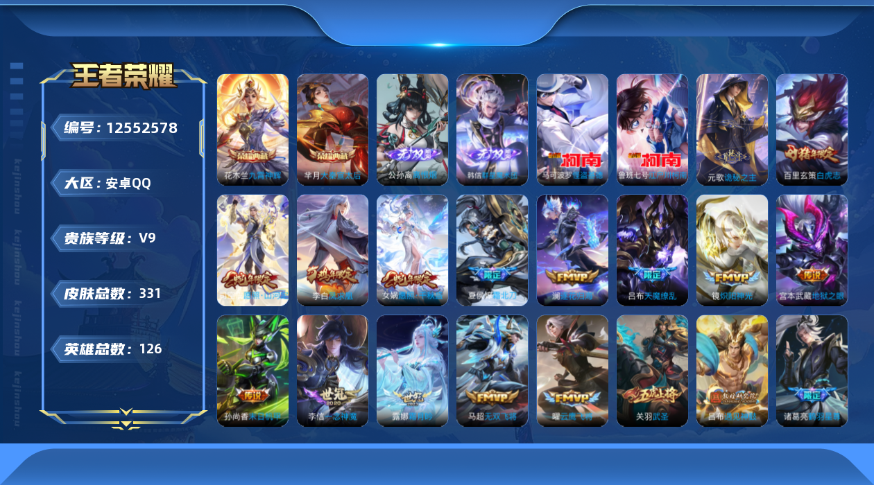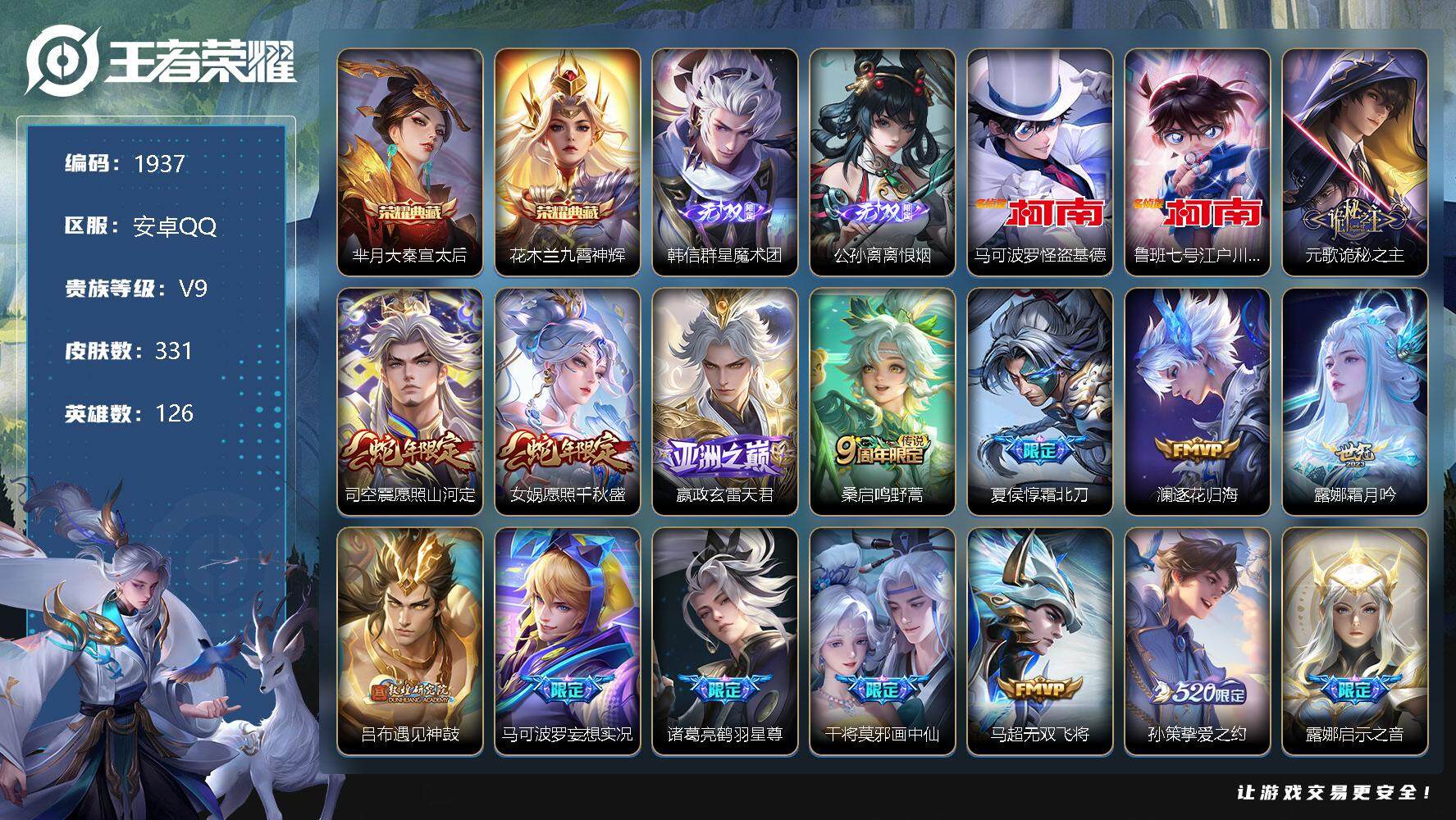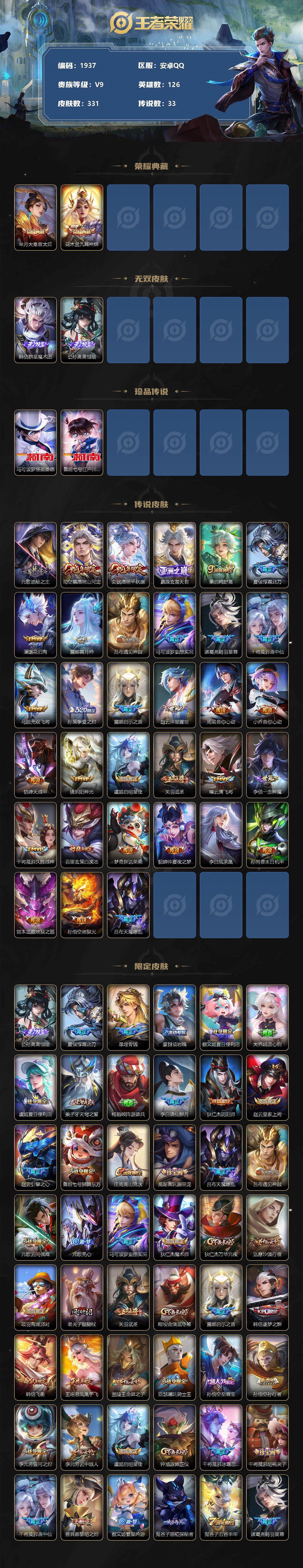 [12552578]【商品标题】:安卓Q-V9-最强王者段位-126英雄-331皮肤-2典藏-0珍品无双-2无双-2珍品传说-33传说-102史诗
