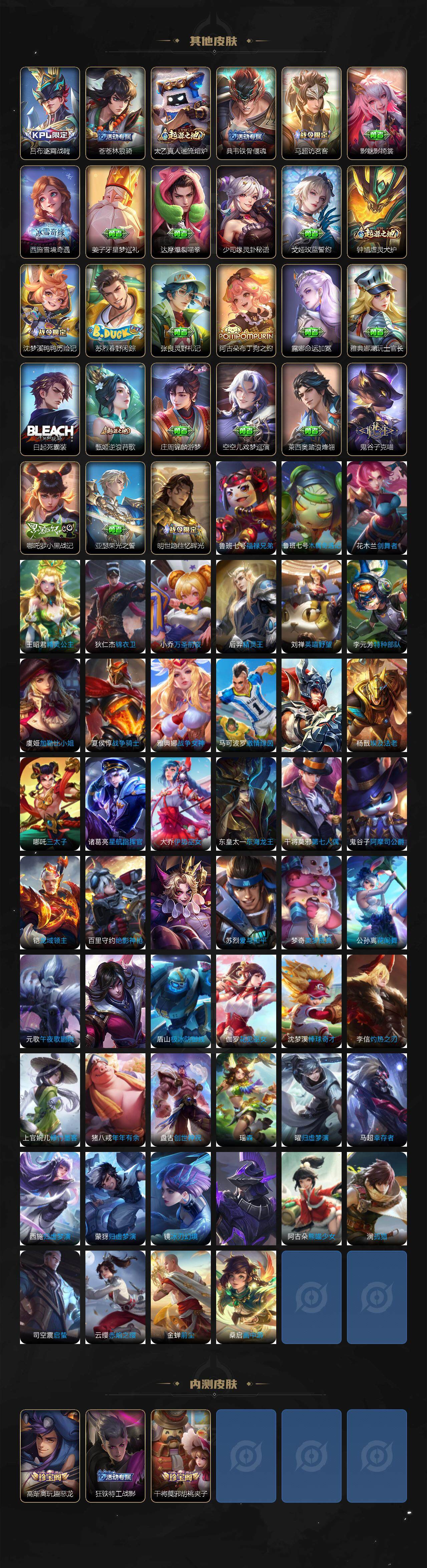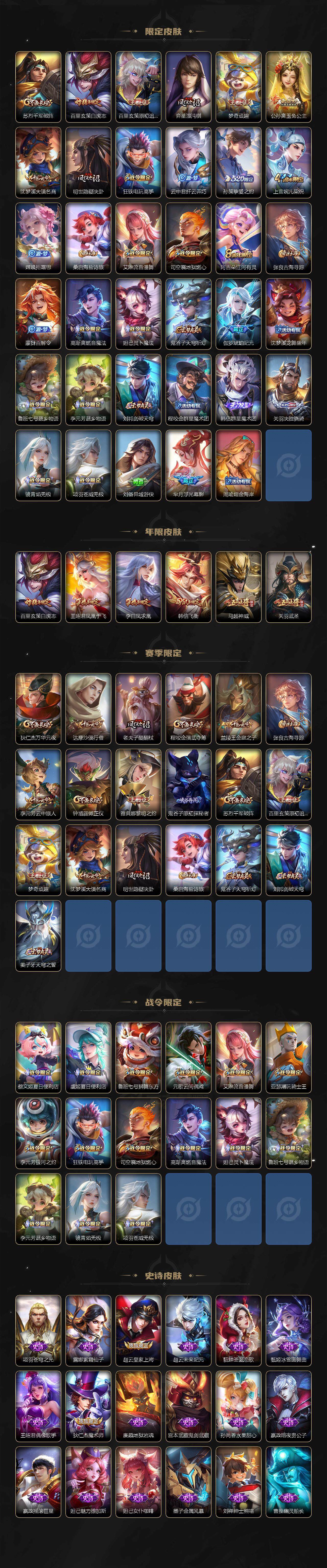 【限定皮肤】:公孙离离恨烟,夏侯惇霜北刀,暃埋骨钱,蒙犽顽岩魄,蔡文姬夏日便利店,大乔绒语心约,虞姬夏日便利店,姜子牙天穹之誓,杨戬破阵退雄兵,李白谪仙醉月,狄仁杰阴阳师,赵云皇家上将,赵云引擎之心,鲁班七号狮舞东方,庄周高山流水,高渐离玩趣恶龙,吕布天魔缭乱,吕布遇见神鼓,元歌云间偶戏,元歌无心,马可波罗妄想实况,狄仁杰魔术师,狄仁杰万华元夜,达摩沙漠行僧,项羽海滩派对,老夫子醍醐杖,关羽武圣,程咬金演武夺筹,露娜启示之音,韩信逐梦之影,韩信飞衡,王昭君凤凰于飞,兰陵王金庭之子,亚瑟潮玩骑士王,孙悟空至尊宝,孙悟空孙行者,李元芳银河之约,李元芳云中旅人,虞姬启明星使,钟馗驱傩正仪,干将莫邪冰霜恋舞曲,干将莫邪胡桃夹子,干将莫邪画中仙,雅典娜黎明之约,蔡文姬繁星吟游,鬼谷子原初探秘者,鬼谷子五谷丰年,诸葛亮鹤羽星尊,苏烈千军破阵,百里玄策白虎志,百里玄策原初追逐者,弈星混沌棋,梦奇顽趣,公孙离玉兔公主,沈梦溪大漠名商,明世隐疑决卦,狂铁电玩高手,云中君纤云弄巧,孙策挚爱之约,上官婉儿梁祝,嫦娥拒霜思,桑启海盐诗旅,艾琳流音漫舞,司空震地狱燃心,阿古朵江河有灵,张良古海寻踪,蒙犽百解令,高渐离燃音魔法,妲己灵卜魔法,鬼谷子天穹祈灯,伽罗琥珀纪元,沈梦溪龙舞盛年,鲁班七号蔬乡物语,李元芳蔬乡物语,刘邦剑破天穹,程咬金群星魔术团,韩信群星魔术团,关羽决胜骁骑,镜