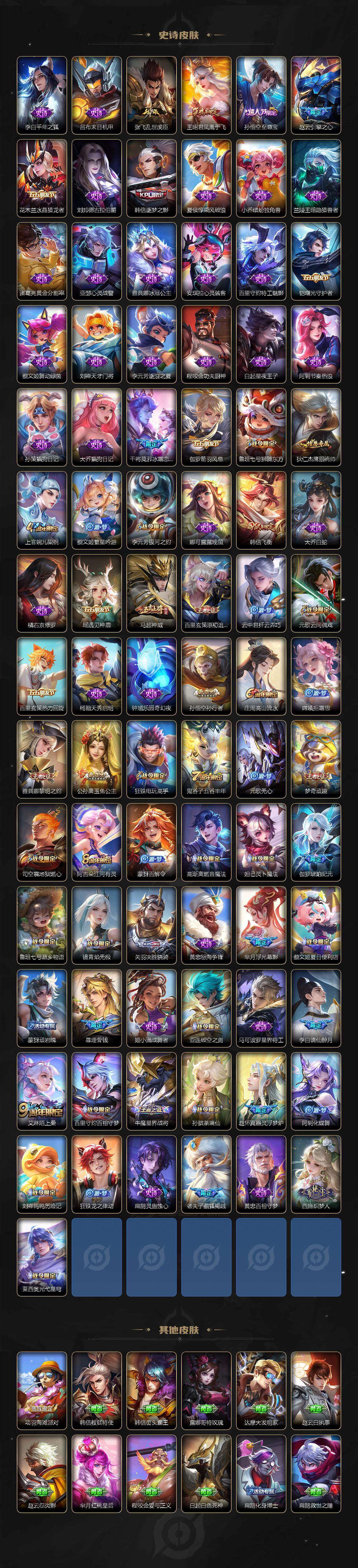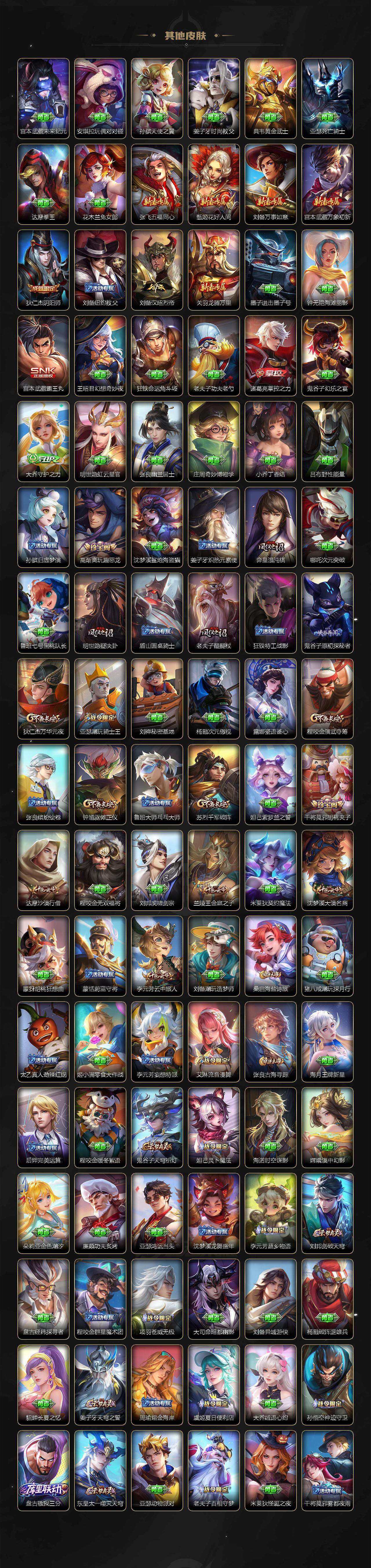 大乔白蛇,瑶遇见神鹿,娜可露露晚萤,伽罗箭羽风息,李元芳逐浪之夏,大乔猫狗日记,孙策猫狗日记,阿轲节奏热浪,露娜紫霞仙子,诸葛亮黄金分割率,王昭君偶像歌手,项羽苍穹之光,雅典娜冰冠公主,吕布末日机甲,橘右京修罗,嬴政摇滚巨星,刘禅绅士熊喵,刘禅天才门将,白起星夜王子,安琪拉心灵骇客,程咬金功夫厨神,刘邦德古拉伯爵,兰陵王暗隐猎兽者,曹操幽灵船长,宫本武藏鬼剑武藏,亚瑟心灵战警,钟馗乐园奇幻夜,杨戬天秀·启明,蔡文姬舞动绿茵,廉颇地狱岩魂,小乔缤纷独角兽,夏侯惇乘风破浪,花木兰水晶猎龙者,铠曙光守护者,百里玄策热力回旋,墨子金属风暴,百里玄策原初追逐者,貂蝉圣诞恋歌,百里守约特工魅影,嬴政暗夜贵公子,嫦娥拒霜思,雅典娜黎明之约,李白千年之狐,蒙犽百解令,高渐离燃音魔法,伽罗琥珀纪元,关羽决胜骁骑,李白谪仙醉月,赵怀真器灵·浮梦炉