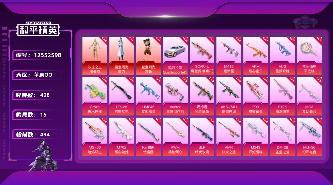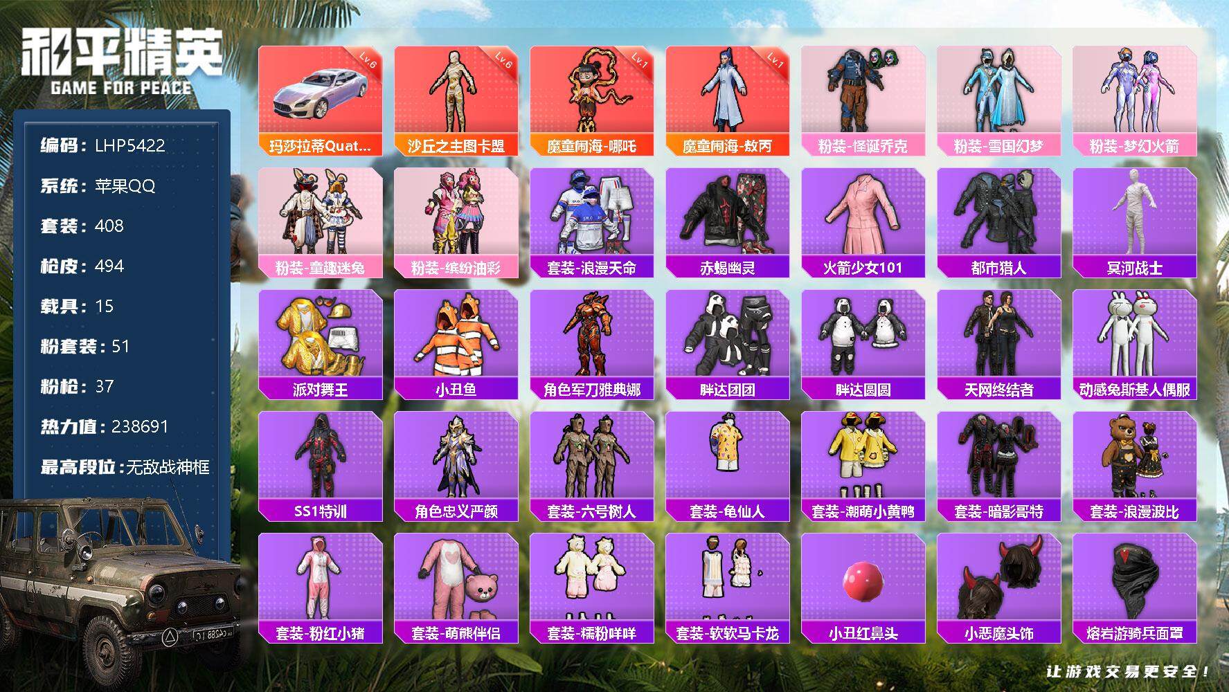 [12552598]素材身法号/沙丘之主-图卡盟(六级)/老101/老木乃伊/玛莎拉蒂Quattroporte(幻星粉)(六级)/M416-超新星(九级)/SCAR-L-魔童闹海 哪吒(九级)/无敌战神框5/绝世印记11/地铁满天赋【特价急出/详情看图】:苹果 手Q-无敌战神框-3神装-51粉装-37特效枪-15载具-13粉色飞行器-23.8w热力值-31王牌印记-408套装-494枪皮【红色载具】:玛莎拉蒂Quattroporte(幻星粉)(六级)【红色神装等级】:魔童闹海-敖丙(一级),魔童闹海-哪吒(一级),沙丘之主-图卡盟(六级)【热门品类】:粉装-怪诞乔克,粉装-雪国幻梦,粉装-梦幻火箭,粉装-童趣迷兔,粉装-缤纷油彩,套装-浪漫天命,套装-赤蝎幽灵,套装-火箭少女101,套装-都市猎人,套装-冥河战士,套装-派对舞王,套装-小丑鱼,角色-军刀雅典娜,套装-胖达团团,套装-胖达圆圆,套装-天网终结者,套装-动感兔斯基人偶服,套装-SS1特训,角色-忠义严颜,套装-六号树人,套装-龟仙人,套装-潮萌小黄鸭,套装-暗影哥特,套装-浪漫波比,套装-粉红小猪,套装-萌熊伴侣,套装-糯粉咩咩,套装-软软马卡龙,小丑红鼻头,小恶魔头饰,熔岩游骑兵面罩,大砍刀-青龙偃月刀,撬棍-龙胆亮银枪,熔岩游骑兵连帽夹克,套装-红熊茄茄【粉色载具】:特斯拉Roadster(水滴蓝),兰博基尼Aventador SVJ(尊享铂),玛莎拉蒂Quattroporte(幻星粉),保时捷911 敞篷版(星珀红),保时捷918 Spyder(液态银),保时捷Cayenne(激情红),合金龙骨(红),踏焰逐风摩托车,鬼马风驰,僚机-冰龙团团,照夜玉狮子,星梦玉骢,黑曜夜骑,冰绡玉鳞【粉色套装】:粉装-极限特训,粉装-怪诞乔克,粉装-甜心巧克力,粉装-宝贝奶油派,粉装-天使彩虹糖,粉装-雪国幻梦,粉装-梦幻火箭,粉装-金属狂野,粉装-缤纷油彩,粉装-放客神游,粉装-极致幻想,粉装-星空之魅,粉装-花间之火,粉装-黄蜂伯爵,粉装-草莓生巧,粉装-冰霜白皇,粉装-童趣迷兔,粉装-炙焰红王,角色-闪耀迪迦,粉装-山涧鹿灵,角色-洛天依,粉装-黑伞漫漫,角色-2号机款机体服,粉装-蓝莓炮弹,粉装-甜心娃娃,粉装-精灵娃娃,粉装-酣梦娃娃,粉装-天之羽翼,粉装-海盐物语,粉装-甜梦小狐,粉装-妙趣可丽,角色-复仇流浪者,粉装