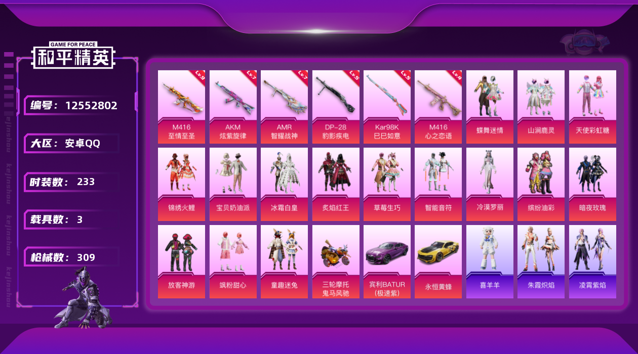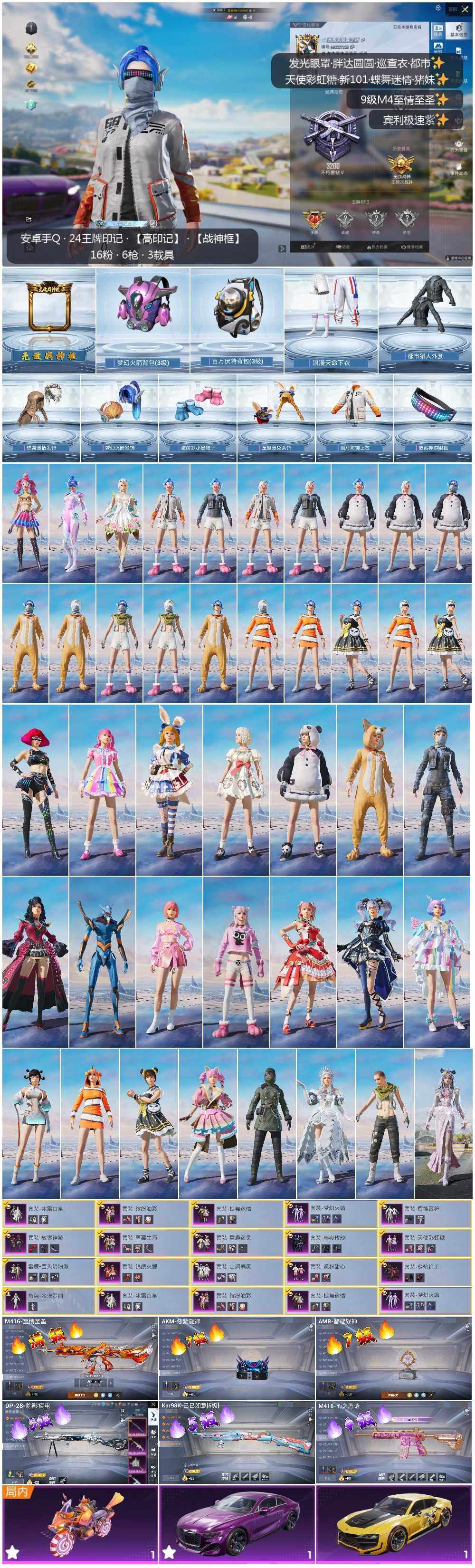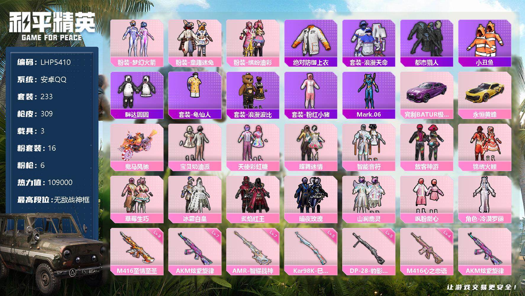 [12552802]素材身法号/无敌战神框3/地铁满天赋/M416-至情至圣(九级)【特价急出/详情看图】:安卓 手Q-无敌战神框-16粉装-6特效枪-3载具-4粉色飞行器-10.9w热力值-24王牌印记-233套装-309枪皮【热门品类】:粉装-梦幻火箭,粉装-童趣迷兔,粉装-缤纷油彩,绝对防御上衣,套装-浪漫天命,套装-都市猎人,套装-小丑鱼,套装-胖达圆圆,套装-龟仙人,套装-浪漫波比,套装-粉红小猪,角色-Mark.06【粉色载具】:宾利BATUR(极速紫),永恒黄蜂,鬼马风驰【粉色套装】:粉装-宝贝奶油派,粉装-天使彩虹糖,粉装-蝶舞迷情,粉装-梦幻火箭,粉装-智能音符,粉装-缤纷油彩,粉装-放客神游,粉装-锦绣火鲤,粉装-草莓生巧,粉装-冰霜白皇,粉装-童趣迷兔,粉装-炙焰红王,粉装-暗夜玫瑰,粉装-山涧鹿灵,粉装-飒粉甜心,角色-冷漠罗丽【粉色枪皮等级】:AKM-炫紫旋律(七级),M416-心之恋语(四级),M416-至情至圣(九级),Kar98K-巳巳如意(五级),AMR-智耀战神(七级),DP-28-豹影疾电(五级)【粉色飞行器】:夏日绵绵冰飞行器,童趣迷兔飞行器,暗翼战神飞行器,赛博古神飞行器