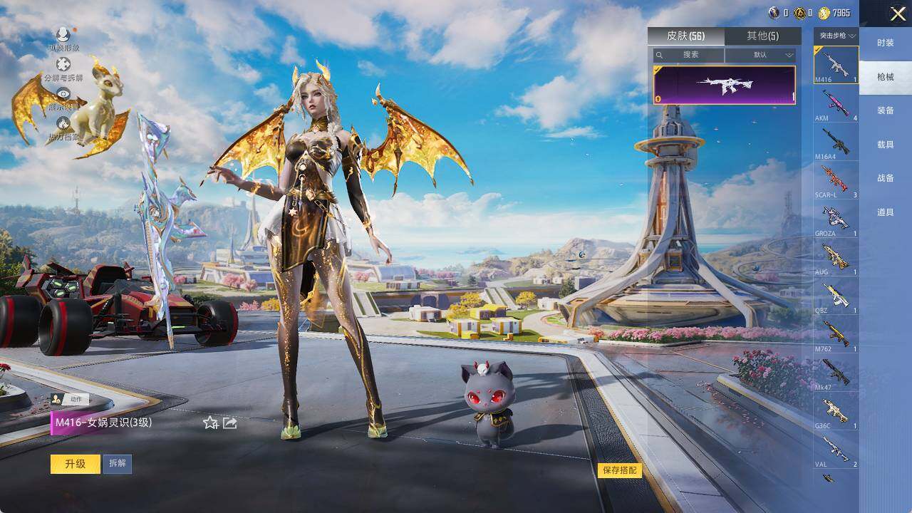 AKM-炫紫旋律,SCAR-L-青春物语,SCAR-L-金蛇镇世,M416-女娲灵识,GROZA-圣辉之星,Kar98K-巳巳如意,Kar98K-圣域龙灵,M24-镜域双华