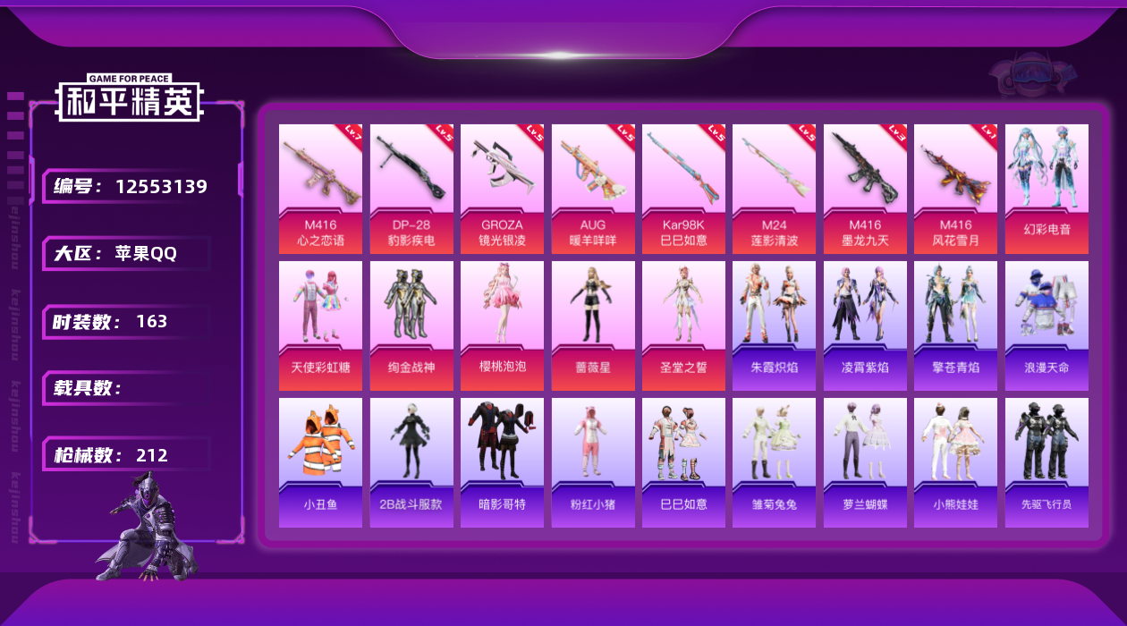 [12553139]素材身法号/绝世印记1/无敌战神框2【特价急出/详情看图】:苹果 手Q-无敌战神框-6粉装-8特效枪-3粉色飞行器-6.6w热力值-15王牌印记-163套装-212枪皮【热门品类】:套装-浪漫天命,套装-小丑鱼,角色-2B战斗服款,套装-暗影哥特,套装-粉红小猪【粉色套装】:粉装-天使彩虹糖,粉装-绚金战神,角色-蔷薇星,角色-圣堂之誓,角色-樱桃泡泡,粉装-幻彩电音【粉色枪皮等级】:M416-心之恋语(七级),M416-风花雪月(一级),M416-墨龙九天(三级),GROZA-镜光银凌(五级),AUG-暖羊咩咩(五级),Kar98K-巳巳如意(五级),M24-莲影清波(五级),DP-28-豹影疾电(五级)【粉色飞行器】:沙丘之主天马,镜域双华-灵镜之阶,龙翔九天飞行器