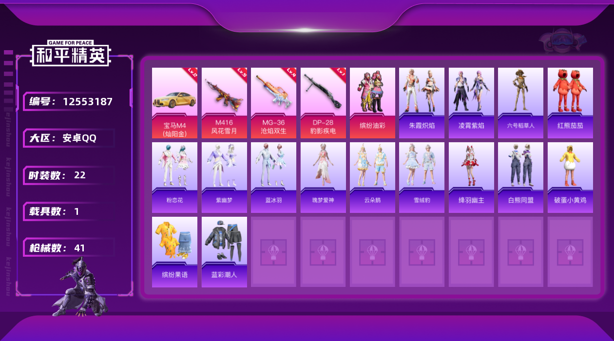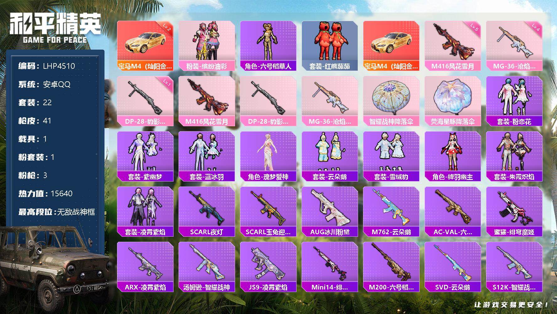 [12553187]无敌战神框1/绝世印记1【特价急出/详情看图】:安卓 手Q-无敌战神框-1粉装-3特效枪-1载具-1.5w热力值-3王牌印记-22套装-41枪皮【红色载具】:宝马M4(灿阳金)(二级)【热门品类】:粉装-缤纷油彩,角色-六号稻草人,套装-红熊茄茄【粉色载具】:宝马M4(灿阳金)【粉色套装】:粉装-缤纷油彩【粉色枪皮等级】:M416-风花雪月(五级),DP-28-豹影疾电(一级),MG-36-沧焰双生(四级)