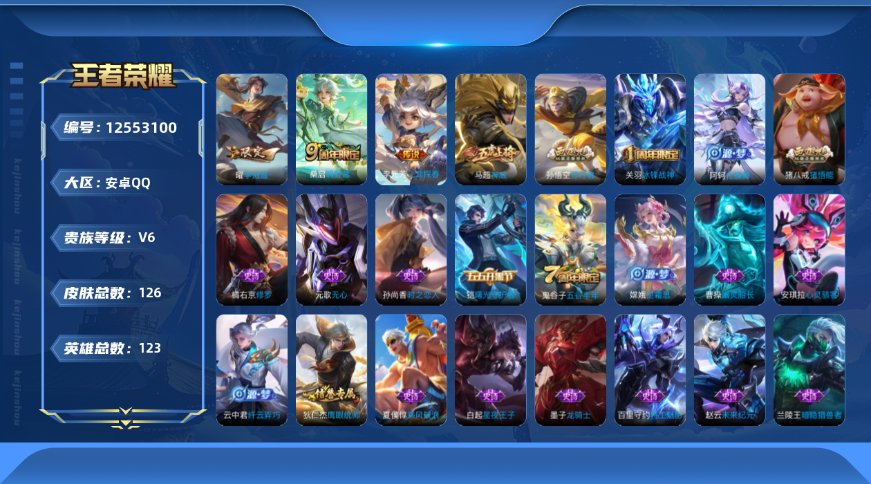 - [12727997]安卓Q-V8-最强王者段位-126英雄-263皮肤-1典藏-0珍品无双-0无双-0珍品传说-13传说-80史诗 【英雄全皮】:鬼谷子全皮,李信全皮,蒙恬全皮,戈娅全皮 【荣耀典藏】:诸葛亮星域神启 【传说皮肤】:桑启鸣野蒿,李信山海炽霜斩,吕布怒海麟威,孙尚香异界灵契,赵云淬星耀世,铠绛天战甲,虞姬启明星使,曜云鹰飞将,李信一念神魔,貂蝉猫影幻舞,干将莫邪久胜战神,诸葛亮武陵仙君,孙悟空地狱火 【限定皮肤】:蒙犽顽岩魄,姜子牙天穹之誓,狄仁杰阴阳师,赵云皇家上将,墨子神迹守卫,嬴政优雅恋人,孙尚香异界灵契,鲁班七号乒乒小将,钟无艳超时空战士,扁鹊奇幻香踪,芈月幻夜卜梦,元歌无心,甄姬落雪兰心,马可波罗暗影游猎,马可波罗山海玄木吟,狄仁杰魔术师,狄仁杰万华元夜,达摩沙漠行僧,项羽海滩派对,老夫子醍醐杖,老夫子航海奇遇记,兰陵王金庭之子,花木兰青春决赛季,孙悟空至尊宝,孙悟空孙行者,后羿圣弓游侠,刘备百相守梦,李元芳云中旅人,虞姬启明星使,钟馗驱傩正仪,杨戬潮玩骑兵,干将莫邪真爱魔法,鬼谷子原初探秘者,鬼谷子五谷丰年,诸葛亮武陵仙君,黄忠火炮绅士,苏烈千军破阵,百里玄策原初追逐者,沈梦溪大漠名商,裴擒虎李小龙,裴擒虎擒涛扼浪,云中君纤云弄巧,李信山海炽霜斩,猪八戒西部大镖客,上官婉儿梁祝,嫦娥拒霜思,嫦娥暖冬兔眠,西施玲珑珍味,鲁班大师探海日志,桑启海盐诗旅,暃星界游侠,戈娅驭风魔法,艾琳女武神,艾琳流音漫舞,司空震地狱燃心,阿古朵江河有灵,张良古海寻踪,蒙恬荣光圣徽,鬼谷子天穹祈灯,沈梦溪龙舞盛年,刘邦剑破天穹,周瑜熔金海岸 【年限皮肤】:马超神威,马可波罗山海玄木吟,李信山海炽霜斩 【赛季限定】:狄仁杰万华元夜,达摩沙漠行僧,老夫子醍醐杖,兰陵王金庭之子,张良古海寻踪,李元芳云中旅人,钟馗驱傩正仪,鬼谷子原初探秘者,苏烈千军破阵,百里玄策原初追逐者,沈梦溪大漠名商,裴擒虎擒涛扼浪,鲁班大师探海日志,桑启海盐诗旅,鬼谷子天穹祈灯,蒙恬荣光圣徽,刘邦剑破天穹,姜子牙天穹之誓 【战令限定】:墨子神迹守卫,钟无艳超时空战士,扁鹊奇幻香踪,芈月幻夜卜梦,甄姬落雪兰心,马可波罗暗影游猎,老夫子航海奇遇记,艾琳流音漫舞,后羿圣弓游侠,杨戬潮玩骑兵,干将莫邪真爱魔法,黄忠火炮绅士,猪八戒西部大镖客,嫦娥暖冬兔眠,西施玲珑珍味,司空震地狱燃心,暃星界游侠,戈娅驭风魔法 【史诗皮肤】