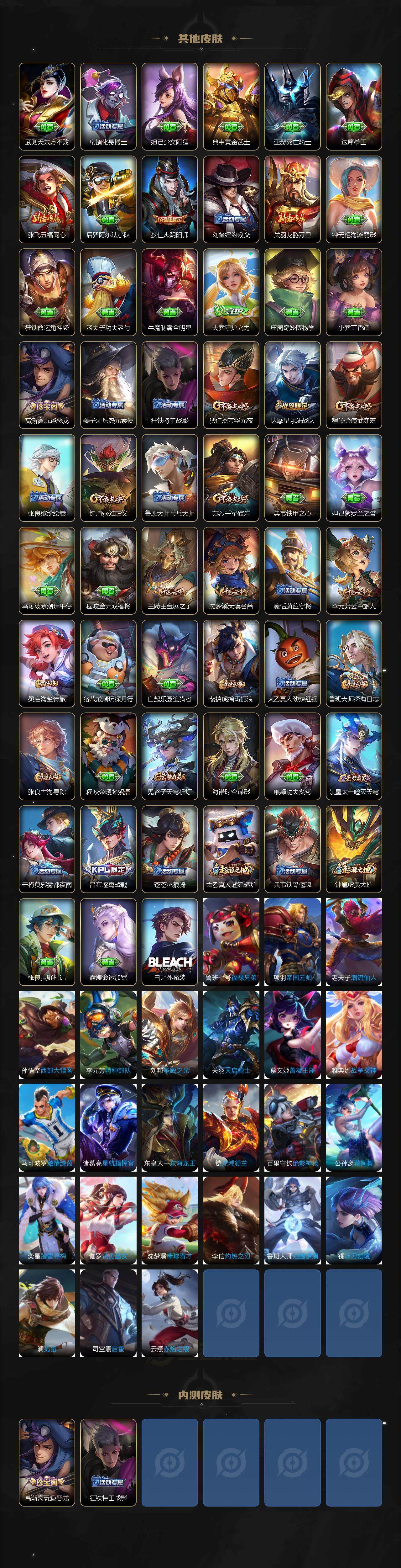 【其他皮肤】:项羽海滩派对,韩信街头霸王,露娜哥特玫瑰,赵云忍炎影,白起白色死神,牛魔西部大镖客,武则天东方不败,扁鹊化身博士,妲己少女阿狸,典韦黄金武士,亚瑟死亡骑士,达摩拳王,张飞五福同心,后羿阿尔法小队,狄仁杰阴阳师,刘备纽约教父,关羽龙腾万里,钟无艳海滩丽影,狂铁命运角斗场,老夫子功夫老勺,牛魔制霸全明星,大乔守护之力,庄周奇妙博物学,小乔丁香结,高渐离玩趣恶龙,姜子牙炽热元素使,狂铁特工战影,狄仁杰万华元夜,达摩星际陆战队,程咬金演武夺筹,张良缤纷绘卷,钟馗驱傩正仪,鲁班大师乓乓大师,苏烈千军破阵,典韦铁甲之心,妲己紫罗兰之誓,马可波罗潮玩牛仔,程咬金无双福将,兰陵