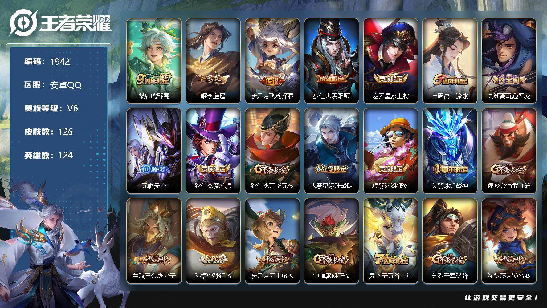 [12553100]【商品标题】:安卓Q-V4-尊贵铂金I段位-124英雄-126皮肤-0典藏-0珍品无双-0无双-0珍品传说-3传说-36史诗