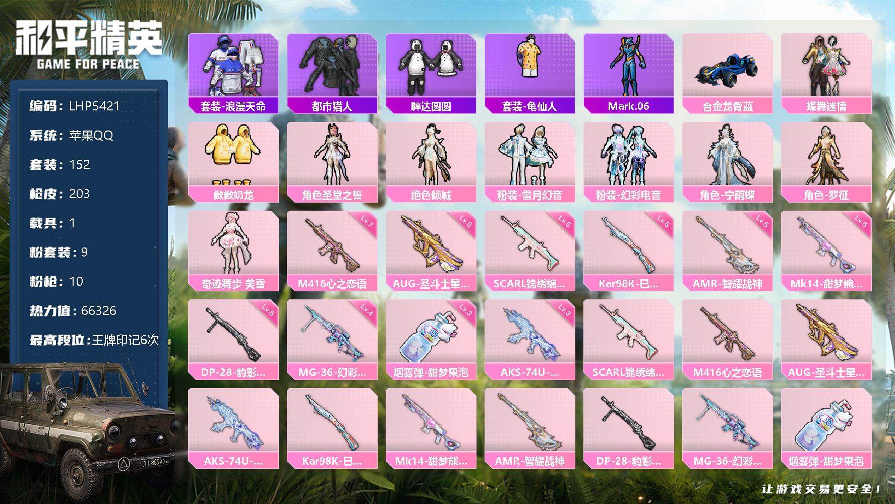 [12553094]素材身法号/地铁满天赋【特价急出/详情看图】:苹果 手Q-9粉装-10特效枪-1载具-3粉色飞行器-6.6w热力值-6王牌印记-152套装-203枪皮【热门品类】:套装-浪漫天命,套装-都市猎人,套装-胖达圆圆,套装-龟仙人,角色-Mark.06【粉色载具】:合金龙骨(蓝)【粉色套装】:粉装-蝶舞迷情,粉装-傲傲奶龙,角色-圣堂之誓,角色-绝色倾城,粉装-雪月幻音,粉装-幻彩电音,角色-宁雨蝶,角色-罗征,角色-奇迹舞步 美雪【粉色枪皮等级】:SCAR-L-锦绣绵绵(五级),M416-心之恋语(七级),AUG-圣斗士星矢(六级),AKS-74U-无垠阁(三级),Kar98K-巳巳如意(五级),Mk14-甜梦熊击(五级),AMR-智耀战神(五级),DP-28-豹影疾电(五级),MG-36-幻彩电音(四级),烟雾弹-甜梦果泡(三级)【粉色飞行器】:春暖花开飞行器,千面幻镜飞行器,飞天猪飞行器