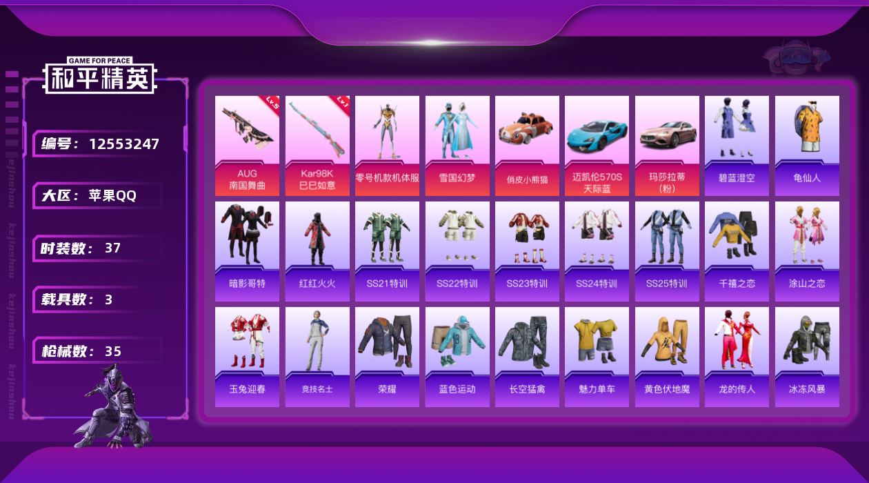 - PX_2077664- 苹果手Q-1王牌印记-4粉装-4特效枪-1载具-23881热力值-69套装-65枪皮-0卓越印记-0传奇印记 【4粉装】,土曜战麒,星云暗核,宙之时溯,万古烈焰 【4特效枪】SCAR-L-万古烈焰-3级 SCAR-L-金蛇镇世-3级 M416-五爪金龙-5级 Kar98K-巳巳如意-1级 【1红装】,金蛇镇世-烛九/1级, 【1稀有紫装】,雪山精英, 【1稀有载具】,护世