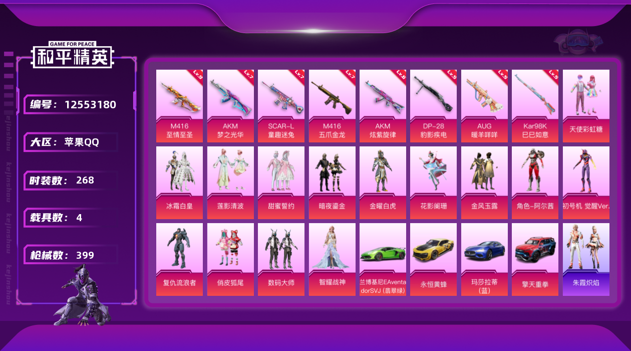 [12553180]素材身法号/M416-至情至圣(九级)/绝世印记1/地铁满天赋【特价急出/详情看图】:苹果 手Q-14粉装-8特效枪-4载具-4粉色飞行器-13.3w热力值-18王牌印记-268套装-399枪皮【热门品类】:套装-都市猎人,套装-深海小丑鱼,角色-军刀雅典娜,套装-金羽特工,套装-忍者信条,套装-龟仙人,套装-浪漫波比,角色-8号机,角色-Mark.06,小恶魔头饰【粉色载具】:兰博基尼Aventador SVJ(翡翠绿),玛莎拉蒂Ghibli(蓝),擎天重拳,永恒黄蜂【粉色套装】:粉装-数码大师,粉装-天使彩虹糖,粉装-金曜白虎,粉装-金风玉露,粉装-甜蜜誓约,粉装-俏皮狐尾,粉装-冰霜白皇,粉装-花影阑珊,角色-复仇流浪者,粉装-暗夜鎏金,角色-阿尔茜,粉装-莲影清波,角色-初号机 觉醒Ver.,角色-智耀战神【粉色枪皮等级】:AKM-炫紫旋律(六级),AKM-梦之光华(七级),SCAR-L-童趣迷兔(七级),M416-五爪金龙(七级),M416-至情至圣(九级),AUG-暖羊咩咩(五级),Kar98K-巳巳如意(五级),DP-28-豹影疾电(五级)【粉色飞行器】:马卡龙飞行器,BEARBRICK飞行器,月下星之子飞行器,飞天猪飞行器
