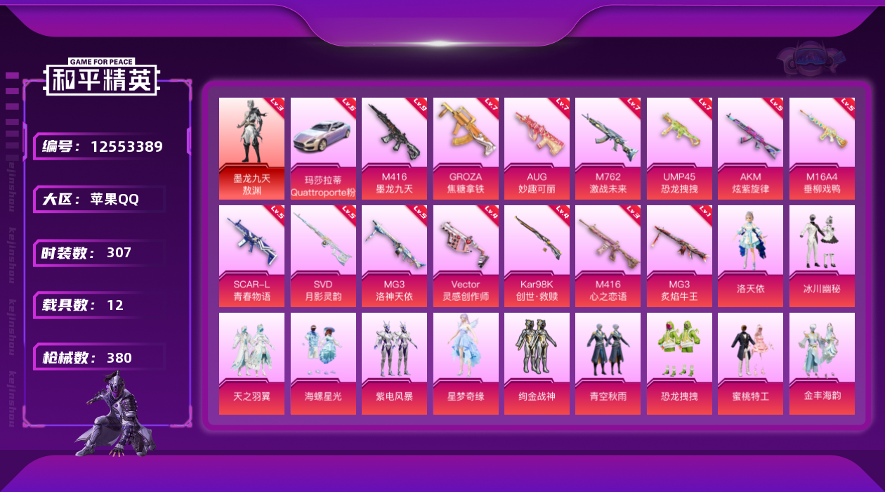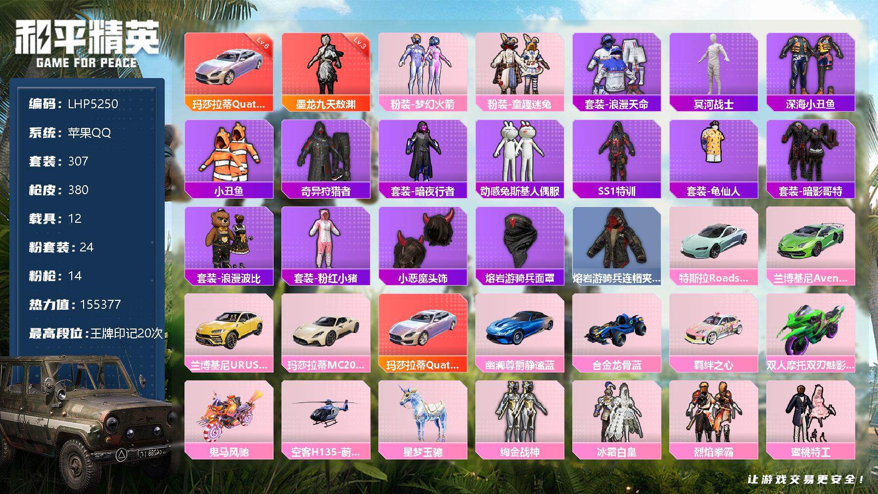 - [12025173]4粉装 6特效枪 2载具 11印记 可二次 可修改实名 身法装备:8号机(新粉螳螂) 优质装备:特斯拉Roadster(水滴蓝),M416心之恋语,Groza香水柠檬,银刃赛罗,俏皮狐尾,七级GROZA-香水柠檬,七级M416-心之恋语,UMP45量子极限,AUG-暖羊咩咩,Kar98K-巳巳如意 热门装扮:蓝莓炮弹,金丰海韵,好奇恐龙 载具:空客H135-蔚蓝之翼,萌喵橘座 稀有枪皮:DP-28-豹影疾电 五级特效枪:五级UMP45-量子极限,五级Kar98K-巳巳如意,五级DP-28-豹影疾电,五级AUG-暖羊咩咩 紫色装扮:SS22特训,SS23特训,娇憨猪猪,酸甜橘柚,暖心橘喵,萌趣咩咩,SS21特训,SS31特训套装,SS2特训,SS3特训,SS5特训,人气偶像,军械专家,冰原使者,,冷焰舞者,凛冬战士,刚毅裁决者,北国孤狼,千禧之恋,SS30特训套装,SS33特训套装,青涩时光,SS20特训,青春冒险家,潮流游乐家,SS15特训,暗夜傀儡,时空追击者,暴风机械师,SS16特训,爆裂葡萄,快乐星愿,遗落祭司,冰爽海盐,银白舞王,SS13特训,骁骑迪迦,诡谋托雷基亚,浪漫樱花,治愈之星,迅捷之星,科技之星,SS14特训,萌趣颜团子,特种颜团子,飞驰魅影,音速流光,SS19特训,吉莉礼服,雪兔飞飞,瑞龙福将,团圆交子,醒狮腾龙,SS17特训,炫光向阳,异彩先驱,缤纷焰火,SS18特训,都市魅力,酒红色名流,酷潮明星,野性战心,长空猛禽,雪山征服者,雪山精英,霓虹极客,霓虹街区,青年教官,迎春赐吉,缤纷果语,荣耀,蓝彩潮人,蓝色运动,虎虎生威吉莉,街头潮人,飞行日记,龙腾端午,骑行爱好者,魅力单车,鹤鸣,麻辣教官,黄色伏地魔,黄色名流,黄色运动,黎明保卫者,黑色伏地魔,龙的传人,龟仙人,冰河战士,龙魂突击队,蝶变,香桃花海,熔岩游骑兵连帽夹克,极速红龙,柠萌假日,格斗先锋,橘黑制服,沙漠兵团,海滨突袭者,深蓝色名流,滨海假日,幻影武者,圣诞大吉,坚韧舞者,夏日音浪,夜莺强袭者,完美偶像,帅气教官,幻世战舞者,怒火燎原,战地督导,战地菁英,探宝勇士,湖蓝色名流,滨海厨神,绮丽涂鸦,疯狂小兔子,白色伏地魔,破晓战魂,破蛋小黄鸡,神秘领域,甜蜜告白,福星高照,空岛之星,空投萌叽,竞技勇士朋克,竞技达人朋克,红色运动,甜蜜熊情侣,王牌教练,牛气冲天,灰色格斗者,灼焰舞