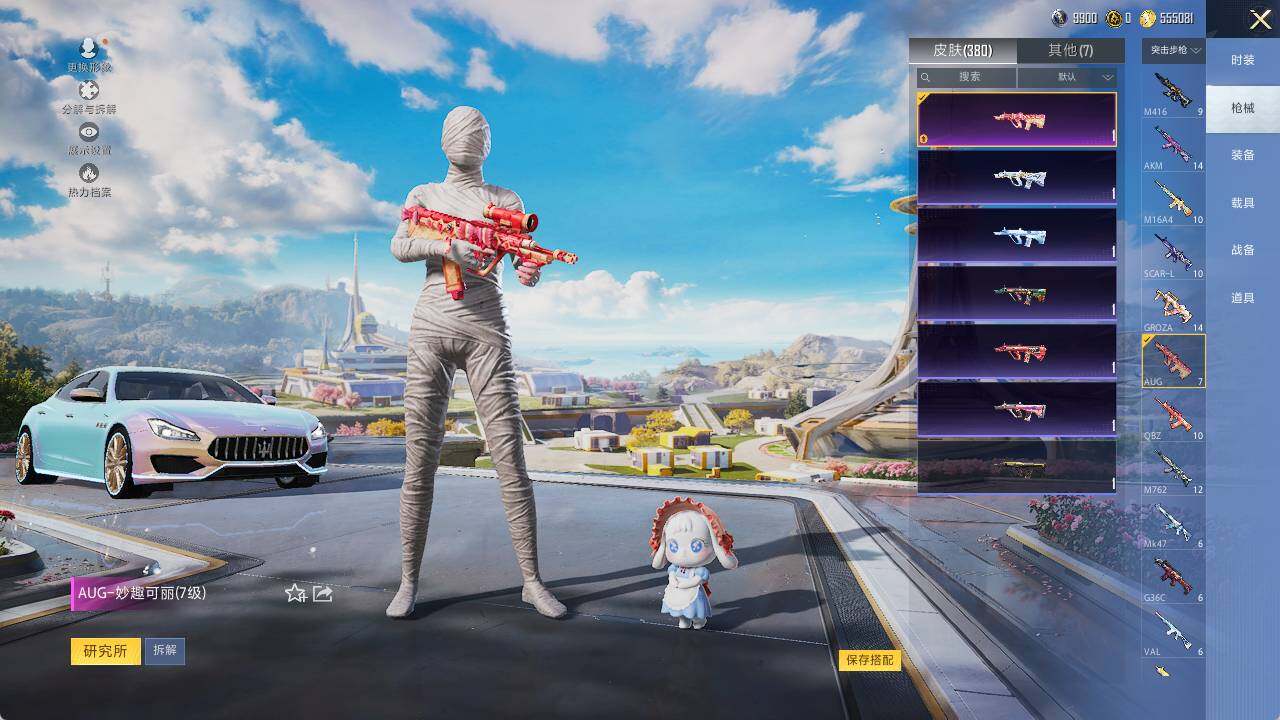 AKM-炫紫旋律,M16A4-垂柳戏鸭,SCAR-L-青春物语,M416-心之恋语,M416-墨龙九天,GROZA-焦糖拿铁,AUG-妙趣可丽,M762-激战未来,UMP45-恐龙拽拽,Vector-灵感创作师,Kar98K-创世·救赎,SVD-月影灵韵,MG3-洛神天依,MG3-炙焰牛王