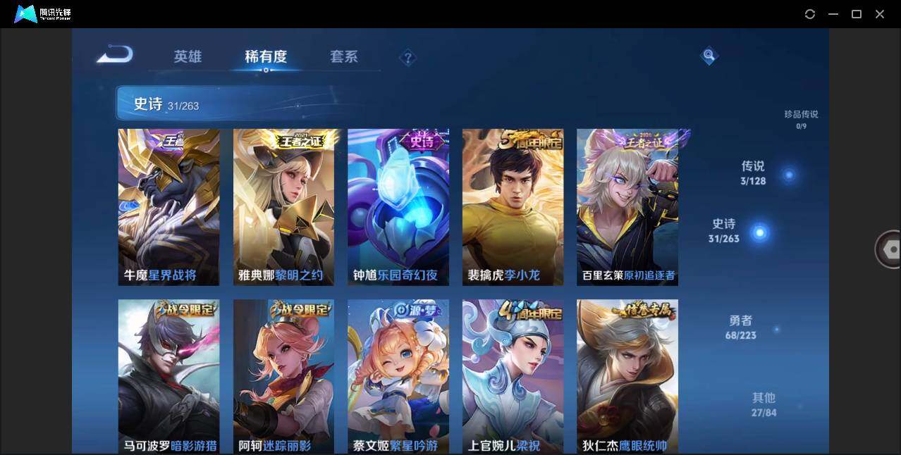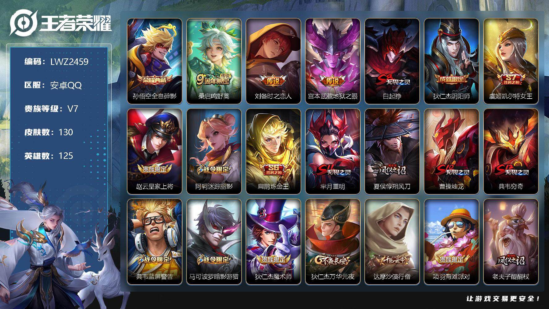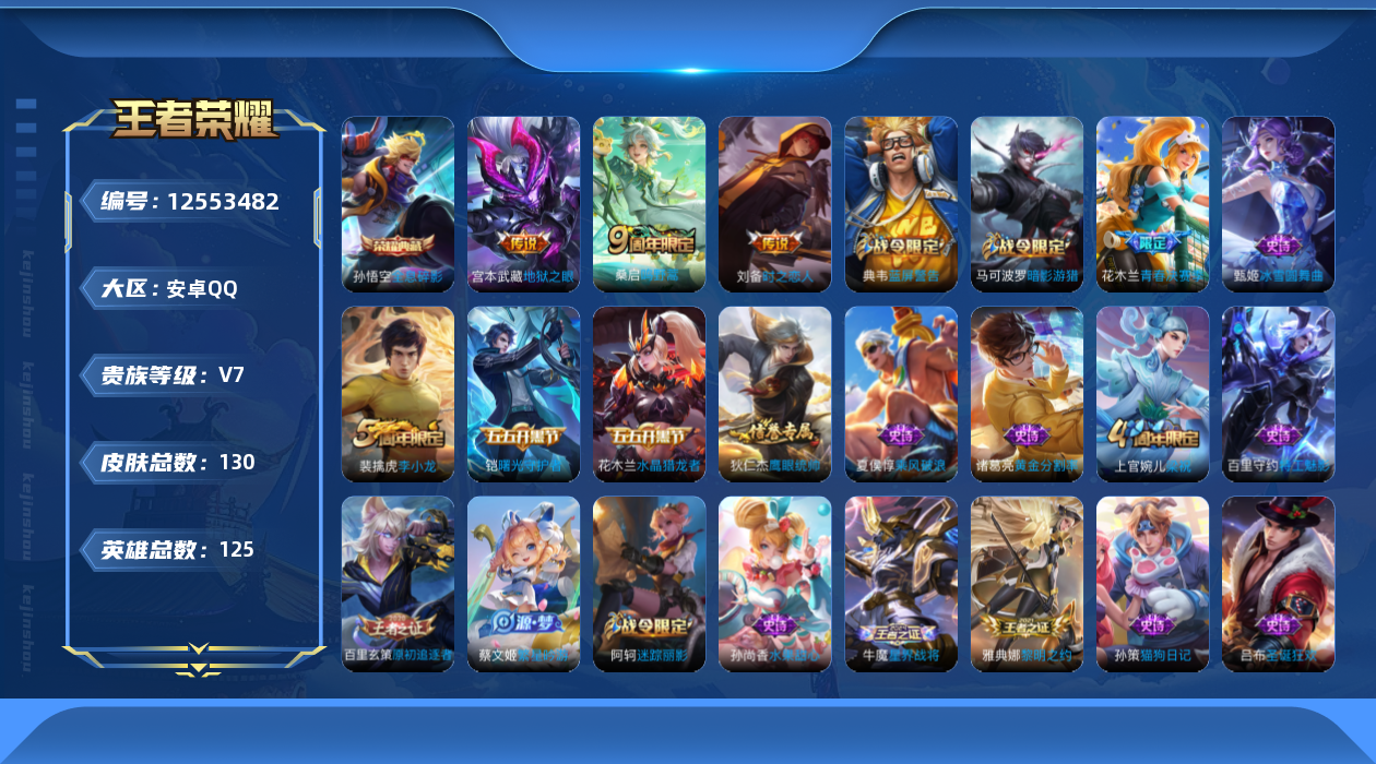 - [12088692]V7 1典藏 11传说 124英雄 209皮肤 可修改实名 优质装备:九霄神辉(木兰典藏),黄金狮子座,地狱之眼,鹤羽星尊 珍宝阁皮:万物之道,优雅恋人 限定皮:愿照·九州拓(澜年限),愿照·福禄聚(蔡文姬年限),愿照·岁时盈(虞姬年限),愿照·山河定(司空震年限),愿照·众生和(妲己年限),愿照·千秋盛(女娲年限),鸣野蒿,白晶晶,无限倾心-项羽,五谷丰年,岱宗(典韦年限),李小龙,山海·玄木吟(马可年限) 史诗皮:鸭鸭历险记-刘禅,器灵·浮梦炉,化蝶舞,星界战将,龙之律动,茶境仙,东方月初,芈月浮光幕影,海诺心动手记,蔬乡物语(鲁班七号),紫霞仙子,特工魅影,千年之狐,永昼,江河有灵,魅语,百解令(蒙犽),高渐离燃音魔法,冰冠公主,偶像歌手,电玩·爆裂旋风,百相守梦(刘备),末日机甲-吕布,猫狗日记-孙策,节奏热浪,女仆咖啡,水果甜心,星夜王子,心灵骇客,暗隐猎兽者,鬼剑武藏,暗渊魔法,舞动绿茵,拒霜思,缤纷独角兽,乘风破浪,逐浪之夏,水晶猎龙者,箭羽风息,唤灵魅影,金属风暴,圣诞狂欢,圣诞恋歌,鹰眼统帅,无心