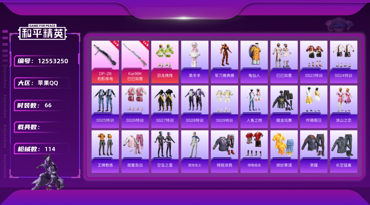 [12553250]【特价急出/详情看图】:苹果 手Q-1粉装-2特效枪-2.9w75热力值-4王牌印记-66套装-114枪皮【热门品类】:角色-军刀雅典娜,套装-龟仙人【粉色套装】:粉装-恐龙拽拽【粉色枪皮等级】:Kar98K-巳巳如意(五级),DP-28-豹影疾电(五级)