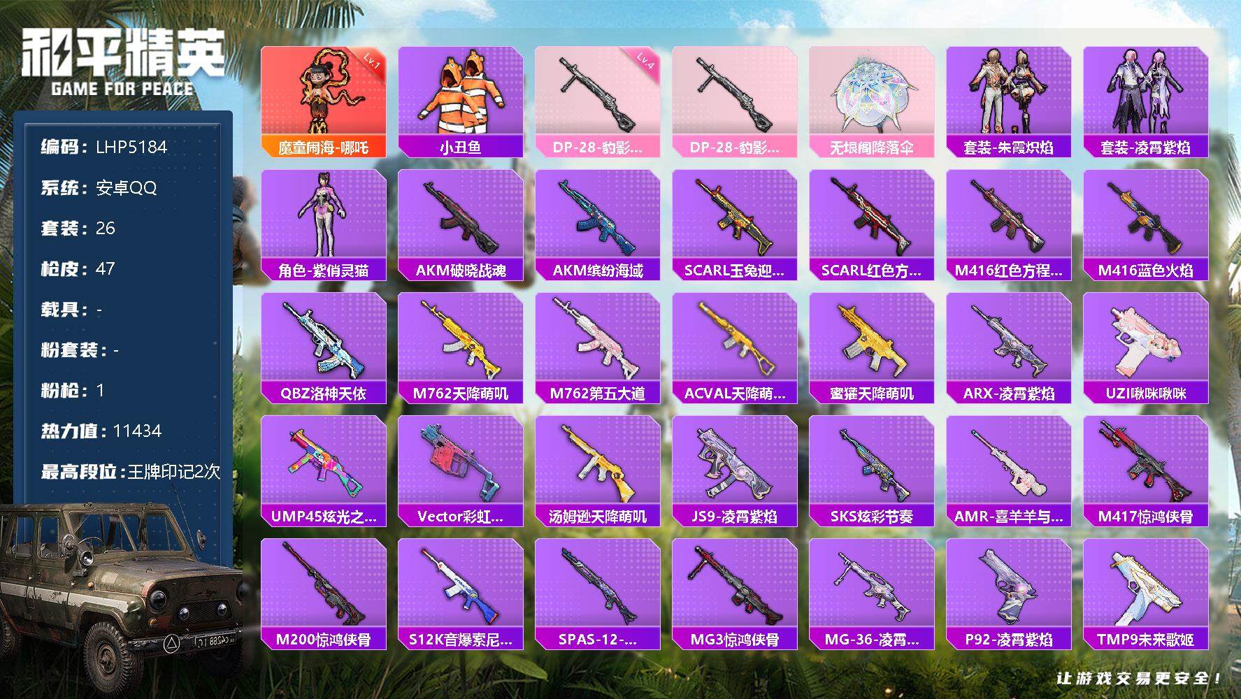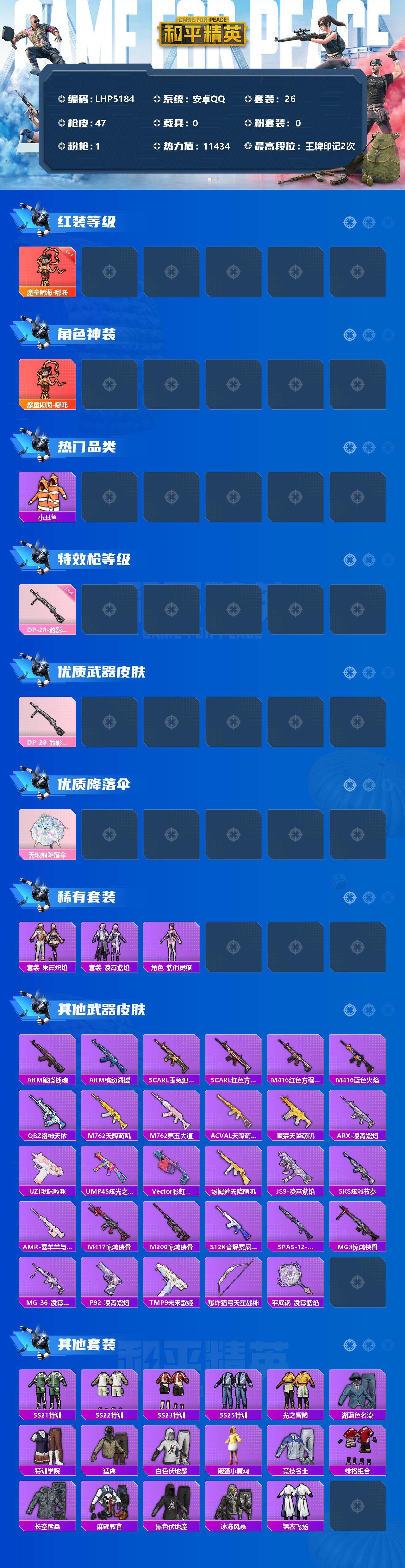 [12553489]【特价急出/详情看图】:安卓 手Q-1神装-1特效枪-1.1w热力值-2王牌印记-26套装-47枪皮【红色神装等级】:魔童闹海-哪吒(一级)【热门品类】:套装-小丑鱼【粉色枪皮等级】:DP-28-豹影疾电(四级)