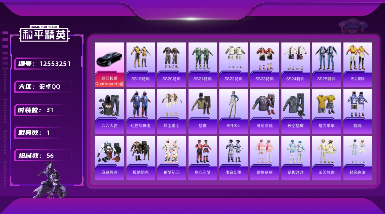 - PX_2106431-安卓QQ 历史总热力值:30615 粉装数量:5 特效枪数量:5 王牌印记:4 历史最高段位:超级王牌16星 套装数量:62 时装数量:214 枪械数量:98 战备数量:73 装备数量:103 时装:套装-傲傲奶龙,套装-憨憨奶龙,套装-纯珍童话,角色-小蓝,角色-烟云彩露,套装-SS23特训,套装-SS24特训,套装-SS25特训,套装-SS26特训,套装-SS27特训,套